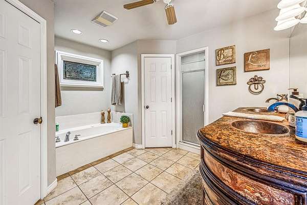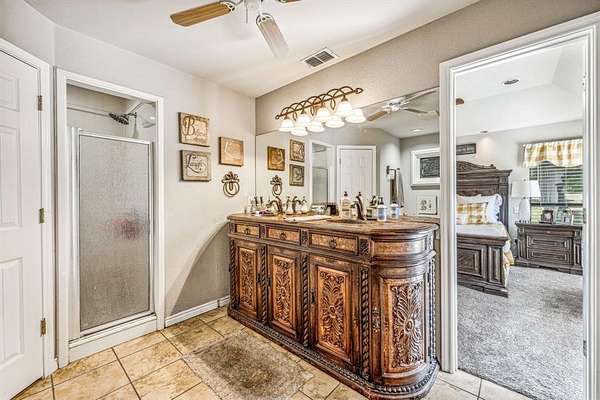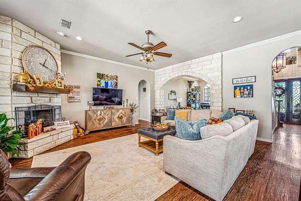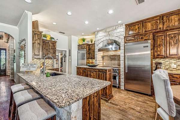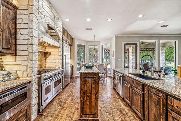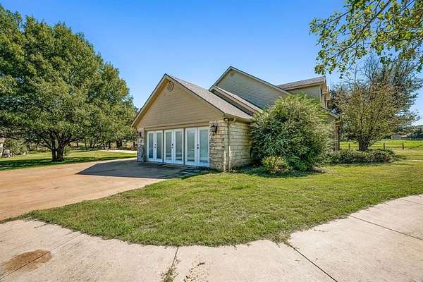 This beautiful 4-bedroom, 3.5-bath home is situated on 16.04 acres along N Hwy 281, just minutes from Stephenville. The impressive rock home features the master suite on the main floor, while three additional bedrooms and two baths are located upstairs. The open-concept lower level boasts a striking gas fireplace that can also be used as wood-burning. The kitchen is equipped with commercial-grade stainless steel Viking appliances, granite countertops, and custom cabinetry.