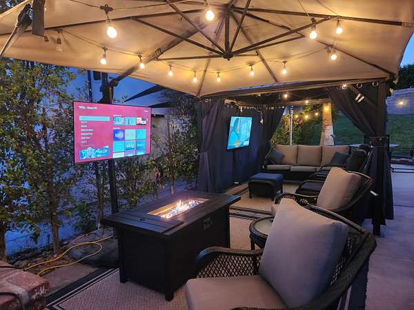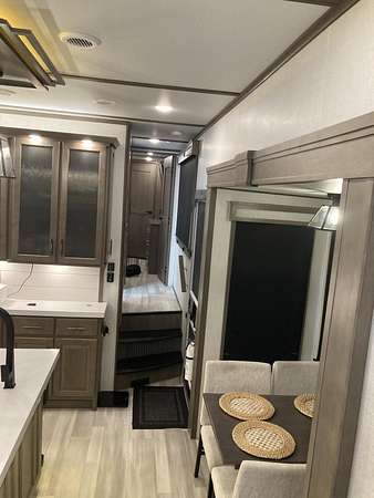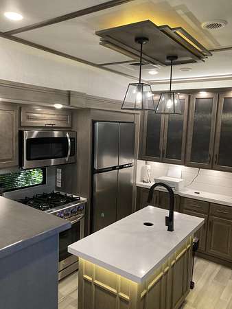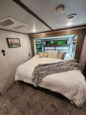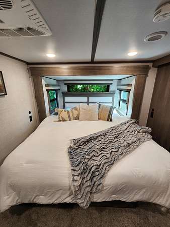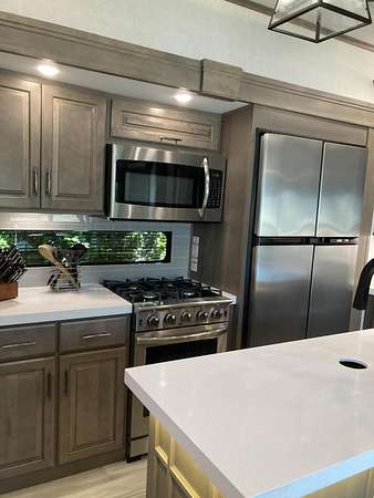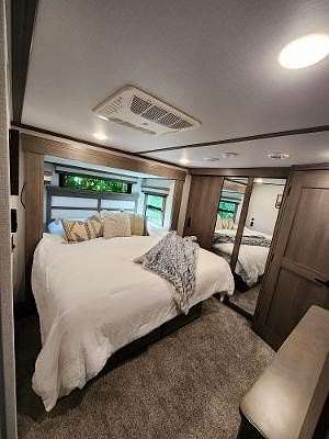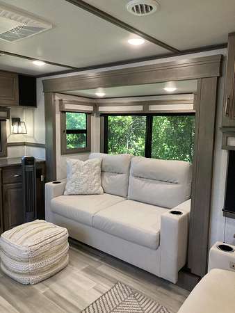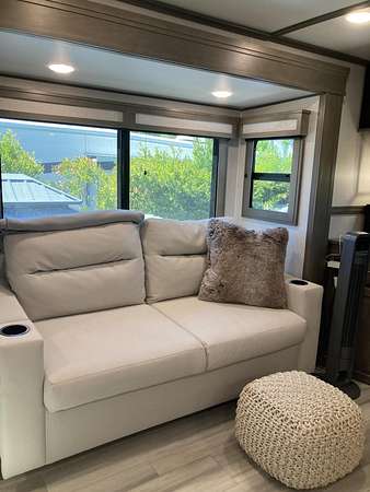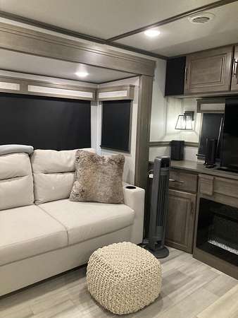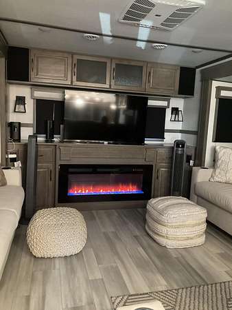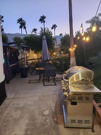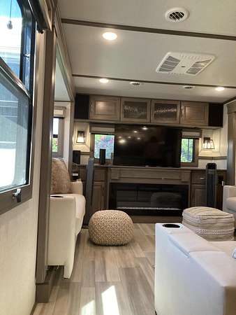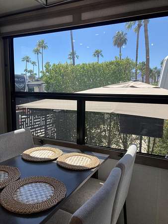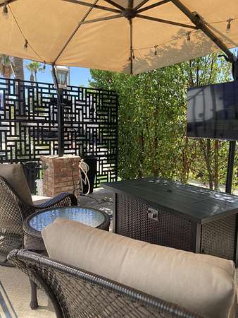 High-End Property Lot 582 with a 2023 Grand Design Solitude for Sale. This remarkable property boasts an impressive array of features, offering the ultimate indoor and outdoor living experience. Situated on an expanded wall lot you'll get to enjoy relaxation and serene solitude. A spacious greenbelt with mature trees provides a tranquil backdrop, while the expansive patio area features dual TVs, LED lights, comfortable seating, a sound system, umbrellas, a gazebo, outdoor heaters, and a fire pit. As evening falls, the ambiance becomes truly enchanting. Be sure to view the evening photos. Inside the RV, a rear living room, beautiful cabinetry, convertible sofas, and stylish bohemian decor await. With picturesque views from nearly every window, this property embodies the perfect blend of luxury and nature.