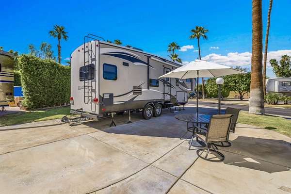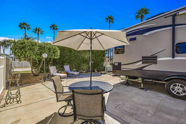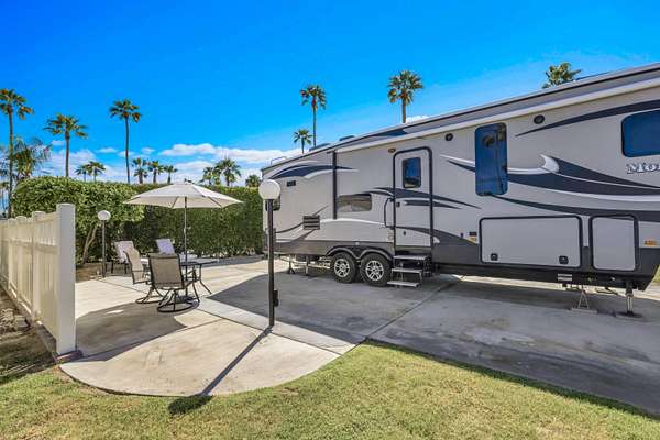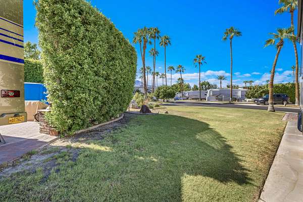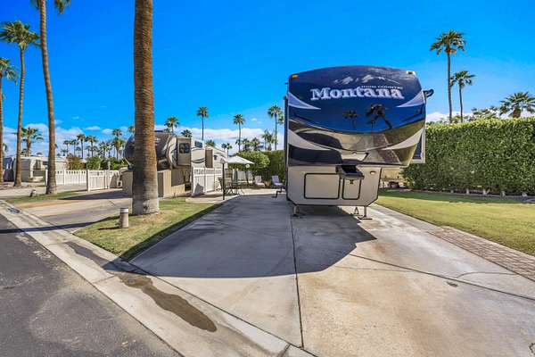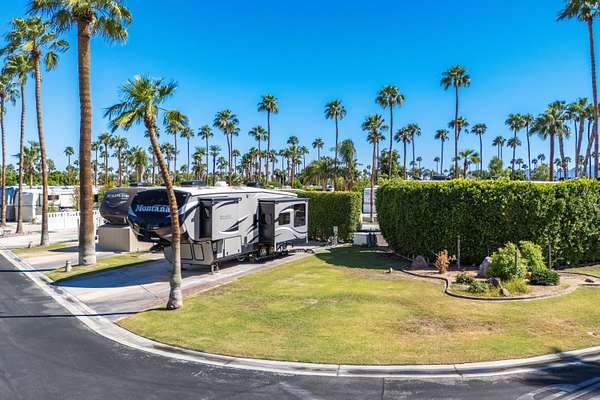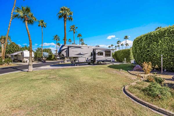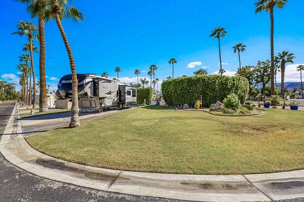 What's great about this lot? Its a terrific corner lot located across from the pool and spa. Capture gorgeous San Jacinto mountain views from the lot and also from interior of rv. Easy carefree low maintenance lot. Laundry and full restroom facilities also just steps away. Located adjacent to a greenbelt so no neighbor directly to the right. Private location and such a great price for the location and a corner lot.