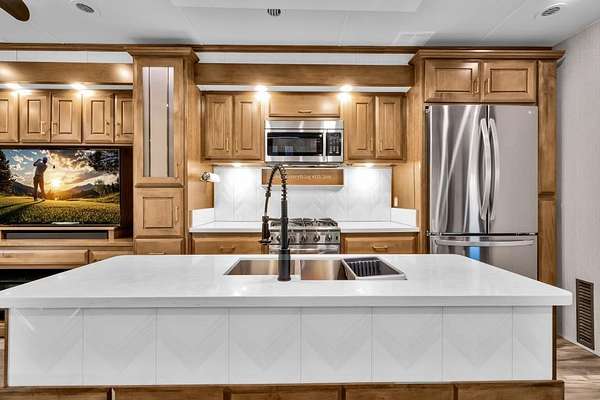 I am delighted to present an exceptional new listing: Lot 737 featuring an immaculate 2021 DRV Mobile Suites - Houston 44. This offering stands out as one of the most exquisitely appointed properties currently available on the market. This expansive corner lot has undergone significant investment, boasting approximately $70,000 in premium outdoor upgrades, ensuring a truly turnkey experience for its new owner. No further work or modifications are required; every detail has been meticulously addressed. The property features fully paved grounds for effortless maintenance and aesthetic appeal, complemented by a custom-built gazebo equipped with convenient electric blinds, ideal for relaxation or entertaining. Additional thoughtful amenities include an extra-wide, comfortable access stairs. The entire perimeter is embraced by mature hedges, providing enhanced privacy and beauty, alongside a comprehensive irrigation system for effortless landscaping care. Integrated seamlessly with this magnificent outdoor space is a next to new 2021 DRV Mobile Suites - Houston 44. This pristine unit, having seen minimal use, exemplifies luxury and thoughtful design. Step inside to discover a luminous, airy, and inviting interior, characterized by abundant natural light. Practicality meets elegance with a dedicated desk area, perfectly suited for remote work or leisurely activities. The unit is fully equipped with modern conveniences, including a dishwasher and an in-unit washer/dryer. The private quarters offer ultimate comfort with a cozy king-sized bed and a lavish walk-in bathroom suite, complete with dual sinks and an exceptionally spacious closet, providing ample storage and sophisticated comfort. This entire package represents an extraordinary opportunity, offering an unparalleled blend of exquisite outdoor living and the sophisticated comfort of a top-tier mobile suite. What a gorgeous package !