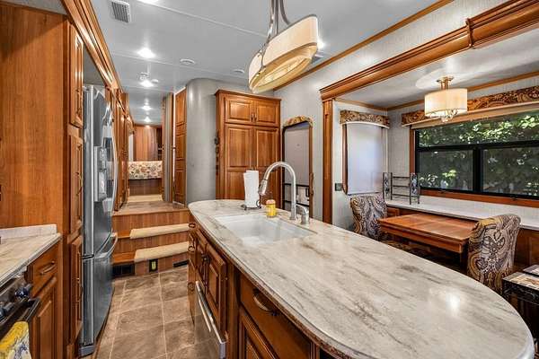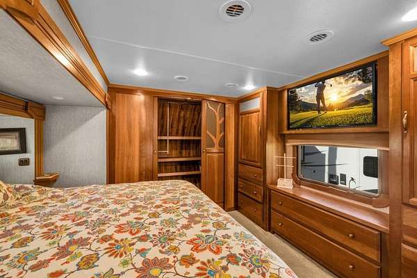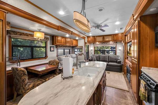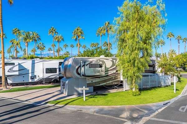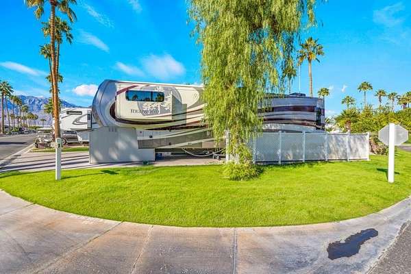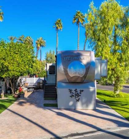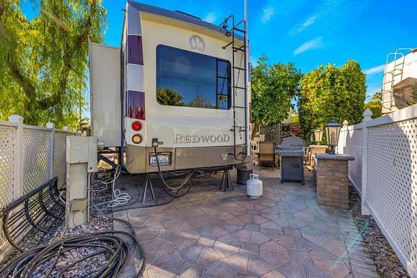 I am pleased to present an exceptional new listing: Lot 82, a premium corner property that offers a truly distinguished living experience. This comprehensive package, attractively priced at $119,000, representing a remarkable opportunity. Located directly opposite the golf course, this location affords not only picturesque views but also unparalleled accessibility to leisure activities. The lot itself has been meticulously developed, featuring an elegant garden-style paving system beautifully accented with intricate brickwork and sophisticated lighting, cultivating an inviting and aesthetically refined outdoor environment. It screams happy hour! Amenities include an on-site restaurant, a state-of-the-art fitness center, a sparkling swimming pool, a rejuvenating spa, and modern shower facilities, all designed to enhance your experience. The outdoor living space includes a charming fire pit, complete with comfortable seating, barbecue, perfect for entertaining guests or enjoying serene evenings outdoors as you can see from the photos. Completed with a 2015 Redwood 38RL recreational vehicle. This RV has been meticulously cared for by its original owners and is presented in beautiful condition and exceptional upkeep. Golf cart with new Trojan batterie included. $119k pkg simply an insane opportunity
