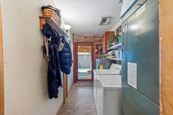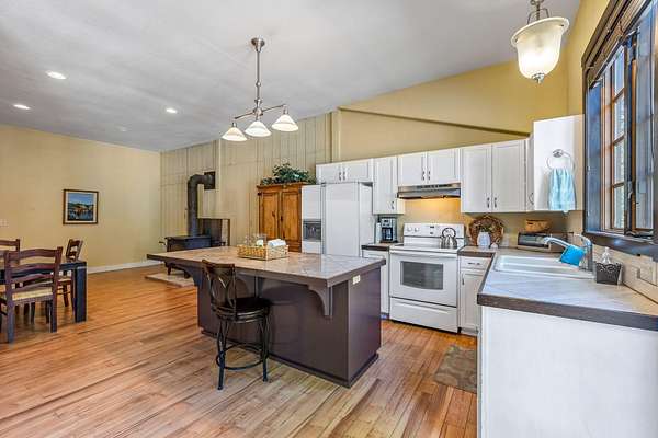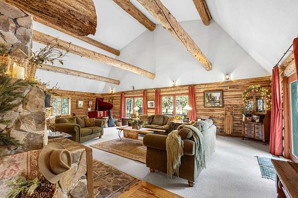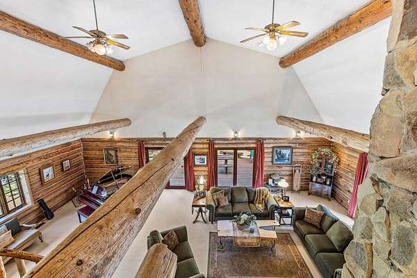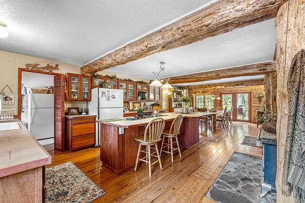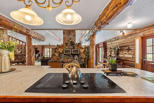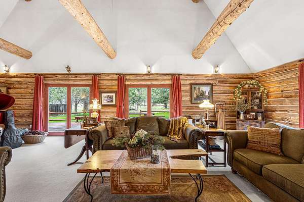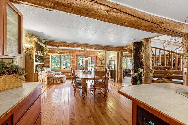 Welcome to your own secluded paradise, boasting the ultimate rustic charm and modern convenience. This stunning handcrafted log home offers a serene retreat from the hustle bustle of everyday life. As you step inside, you're greeted by the captivating sight of a log slab spiral staircase, artfully crafted around a majestic tree trunk, leading up to a mezzanine that overlooks the spacious grand room. Perfect for entertaining or simply unwinding in the ambiance of natures embrace. The heart of the home is the open kitchen, exudes warmth and functionality, featuring a cast iron stove that adds to the rustic charm of the log cabin ambiance. The main suite is located on the ground floor, The four upstairs bedrooms have their own vanites. The outbuilding can accommodate a motor home and a car. It also has an aprox. 1100 sq.ft. apt. A greenhouse and chicken coop are a bonus. Recent upgrades include a new well pump and drain field extension. New Wood Stove . New Carport Roof