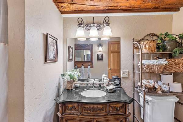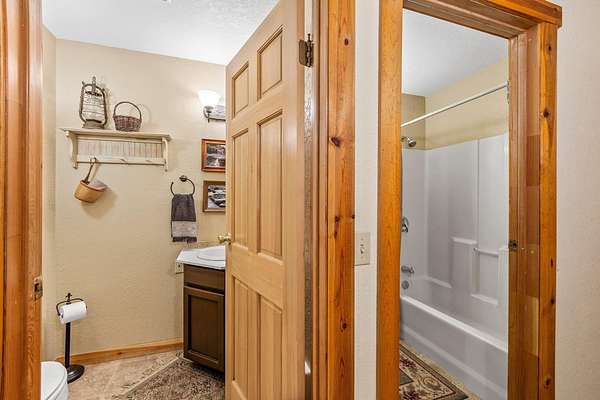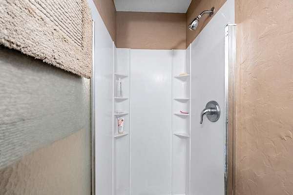 - Breakfast Bar, Ceiling Fan(s), Fiberglass Stall Shower, Pantry, Primary Downstairs, Shower/Tub Combo, Tile Counters, Vaulted Ceiling(s), Walk-In Closet(s)
