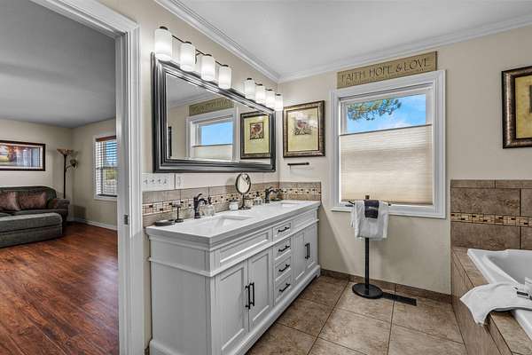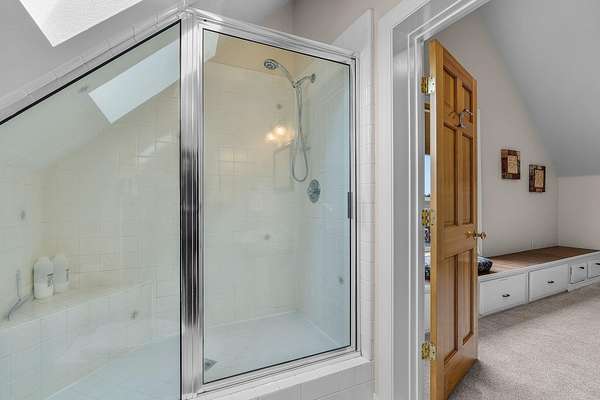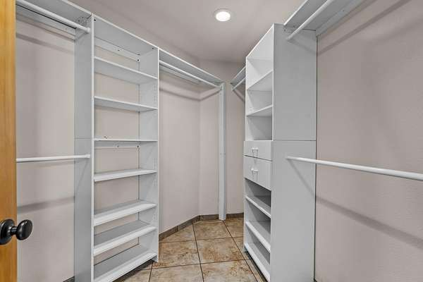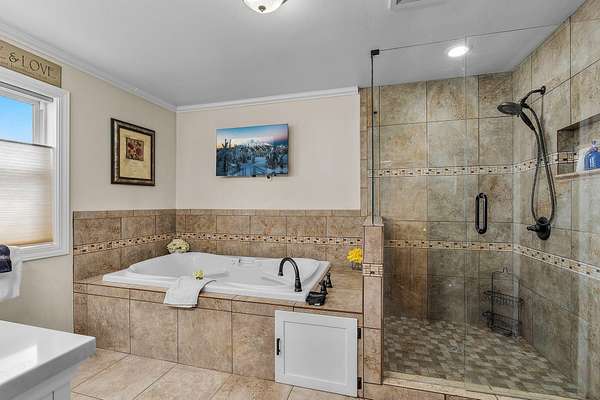 - Built-In Features, Ceiling Fan(s), Central Vacuum, Double Vanity, Granite Counters, High Speed Internet, Kitchen Island, Linen Closet, Pantry, Primary Downstairs, Shower/Tub Combo, Smart Lock(s), Smart Thermostat, Soaking Tub, Tile Shower, Vaulted Ceiling(s)
