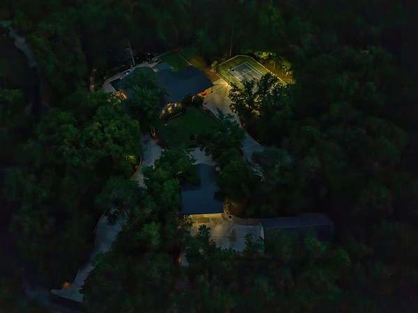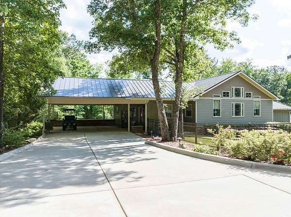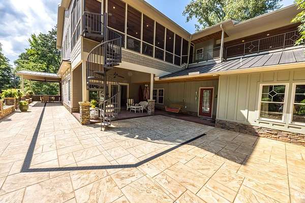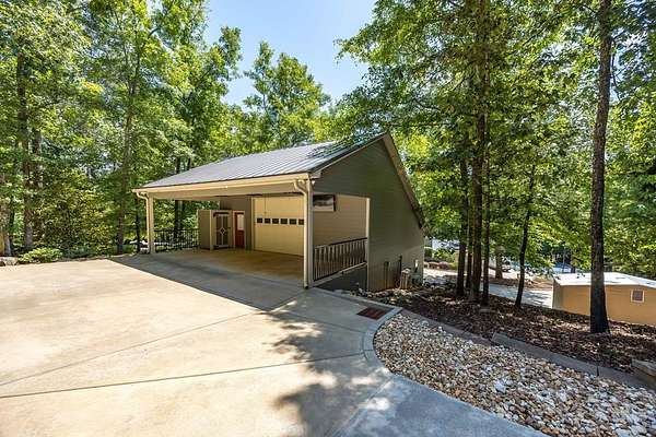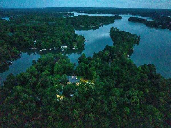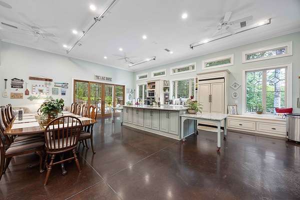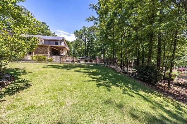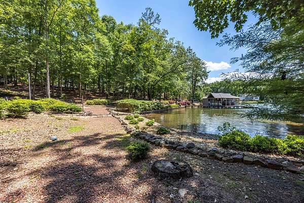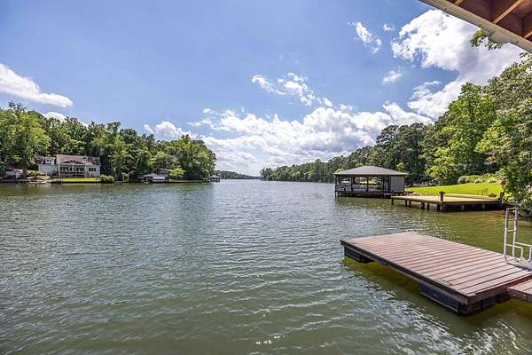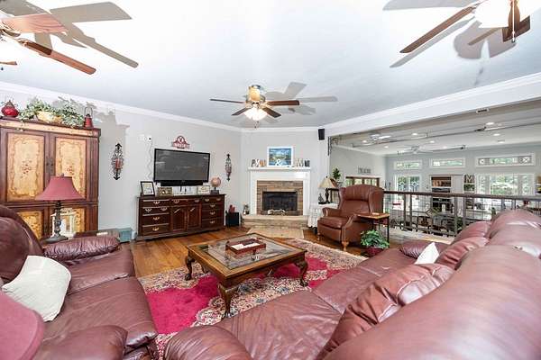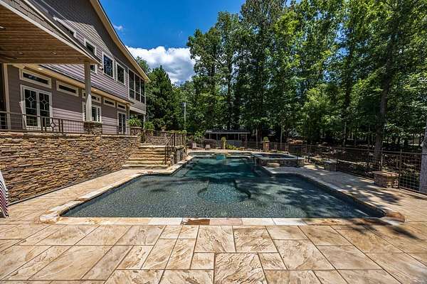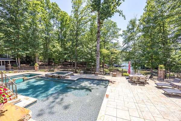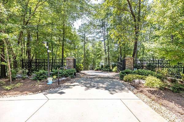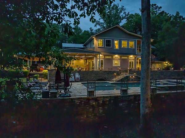 This exceptional lakefront estate offers resort-style living with amenities thoughtfully designed for both relaxation and entertaining. Privately gated and nestled on 3.34 acres of beautifully landscaped grounds, the home showcases over 7,000 square feet of refined living space with 10,855 under roof, featuring 5 bedrooms and 7 full bathrooms. Step outside to your own private retreat, complete with a saltwater gunite pool and jacuzzi, tennis/pickleball courts, and a spacious pavilion with a stone fireplace-perfect for hosting family and friends. Meandering walking trails, stone waterfalls, and multiple outdoor gathering areas enhance the tranquil lakefront setting. Inside, the great room impresses with cathedral-beamed ceilings, rich hardwood floors, and a stunning stone fireplace. The gourmet kitchen on the main level features a large island, high-end finishes, and ample space for entertaining. The luxurious primary suite offers custom built-ins and opens to a private screened porch with its own fireplace and hot tub. The en suite bath includes a soaking tub and a beautifully tiled walk-in shower. Designed for flexibility and ideal for large or multi-generational families, the home offers multiple living areas, three full kitchens, two bonus rooms, a loft, and two laundry rooms. Additional highlights include an RV garage, a detached two-car garage with extra storage, and a double boathouse with floating dock and seawall. This is a rare opportunity to own a one-of-a-kind lakefront estate blending privacy, space, and lifestyle in one extraordinary property.