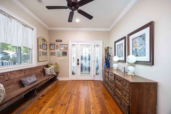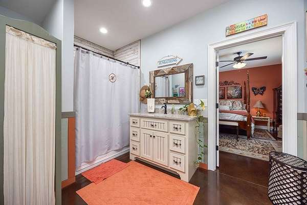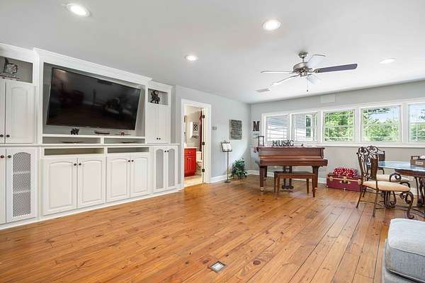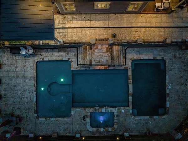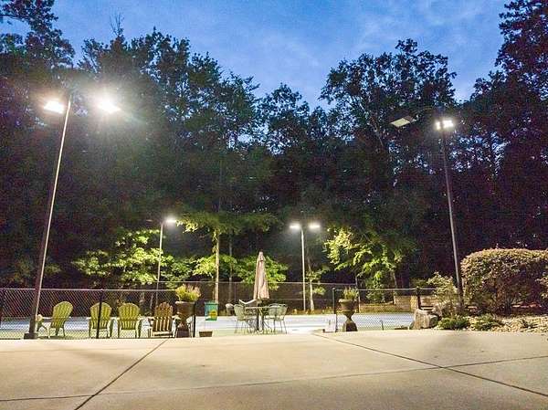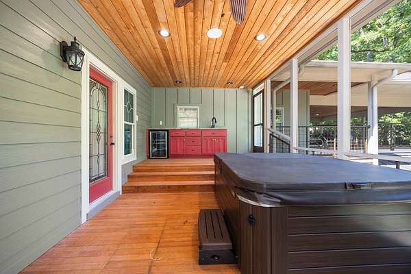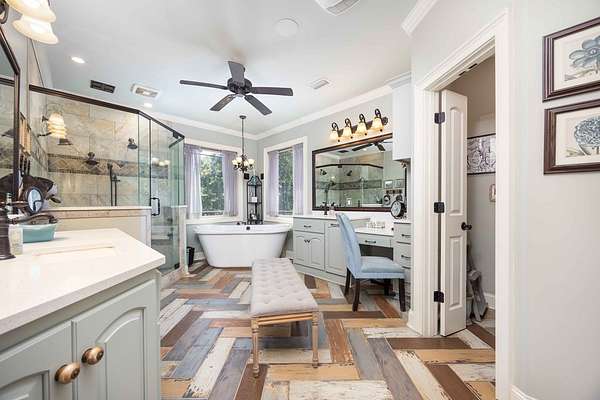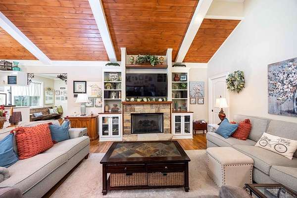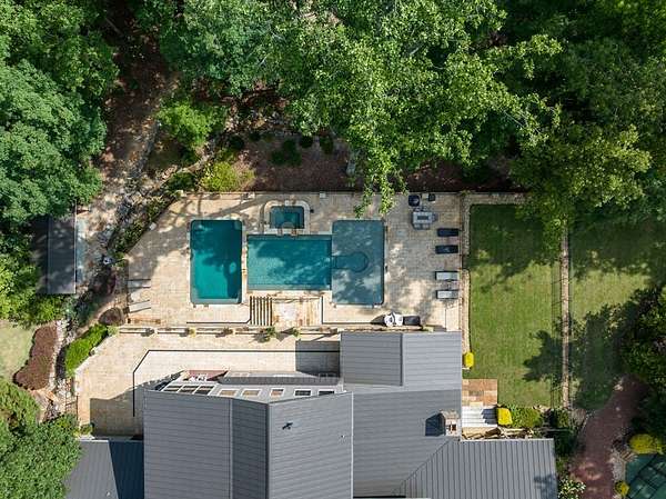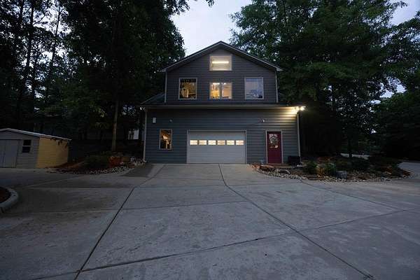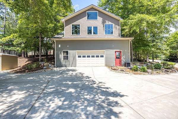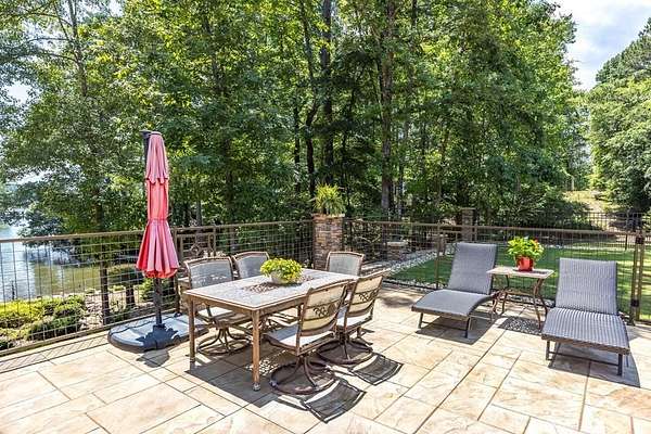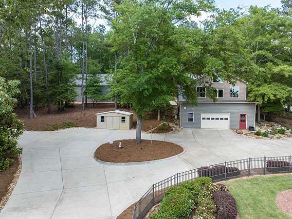 This exceptional lakefront estate offers resort-style living with amenities thoughtfully designed for both relaxation and entertaining. Privately gated and nestled on 3.34 acres of beautifully landscaped grounds, the home showcases over 7,000 square feet of refined living space with 10,855 under roof, featuring 5 bedrooms and 7 full bathrooms. Step outside to your own private retreat, complete with a saltwater gunite pool and jacuzzi, tennis/pickleball courts, and a spacious pavilion with a stone fireplace-perfect for hosting family and friends. Meandering walking trails, stone waterfalls, and multiple outdoor gathering areas enhance the tranquil lakefront setting. Inside, the great room impresses with cathedral-beamed ceilings, rich hardwood floors, and a stunning stone fireplace. The gourmet kitchen on the main level features a large island, high-end finishes, and ample space for entertaining. The luxurious primary suite offers custom built-ins and opens to a private screened porch with its own fireplace and hot tub. The en suite bath includes a soaking tub and a beautifully tiled walk-in shower. Designed for flexibility and ideal for large or multi-generational families, the home offers multiple living areas, three full kitchens, two bonus rooms, a loft, and two laundry rooms. Additional highlights include an RV garage, a detached two-car garage with extra storage, and a double boathouse with floating dock and seawall. This is a rare opportunity to own a one-of-a-kind lakefront estate blending privacy, space, and lifestyle in one extraordinary property.