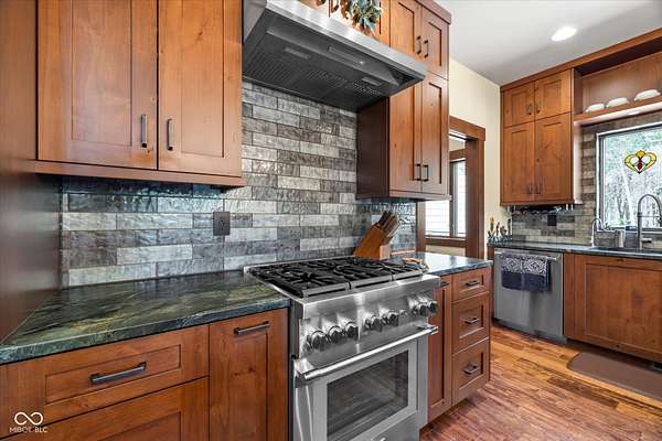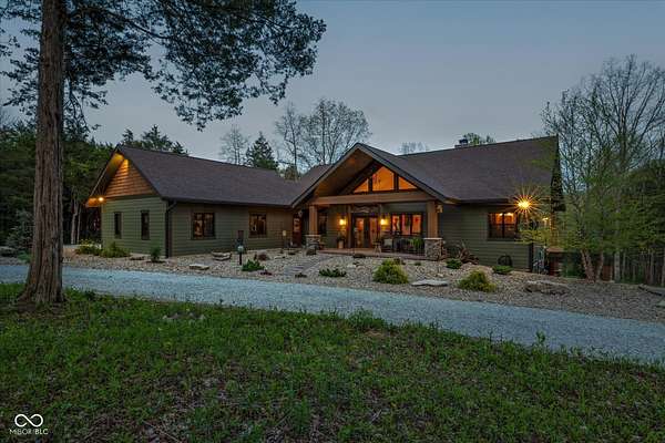 Tucked away on 5 serene, wooded acres, this absolutely stunning custom-built ranch is a showcase of true Amish craftsmanship and uncompromising quality. Every inch of this 3-bedroom, 3-bath home reflects thoughtful intention-from hand-scraped hickory flooring and intricate millwork to heated floors and custom cabinetry-creating a level of refinement that is nothing short of extraordinary. Walls of windows and four sliding doors flood the home with natural light and dissolve the boundaries between indoors and out, allowing nature to become a seamless extension of your living space. The great room, crowned with soaring hickory-accented cathedral ceilings and anchored by a striking natural stone fireplace, opens effortlessly to the chef's kitchen. Outfitted with Thermador appliances, a generous center island topped with leathered granite, and exceptional craftsmanship throughout, this kitchen is designed for both everyday living and memorable entertaining. The main-level primary suite is a peaceful retreat, offering sweeping views of the property and a spa-like bath complete with a zero-threshold shower, whirlpool tub for two, double vanities, heated floors, and a spacious walk-in closet. The walkout lower level adds flexibility with an additional bedroom and full bath, plus a third finished space currently used as a sitting room that could easily function as a bedroom. Outdoor living is elevated with a wraparound TimberTech deck featuring a built-in gas firepit ideal setting to unwind, entertain, and take in the beauty of your private wooded sanctuary. The location is unbeatable, especially for outdoor enthusiasts and sports lovers. This property is the perfect year-round home or weekend retreat with easy access to boating, hiking, cross-country skiing, and more. Cheer on IU football, basketball, and countless other activities just minutes away-making it easy to embrace the best of every season.