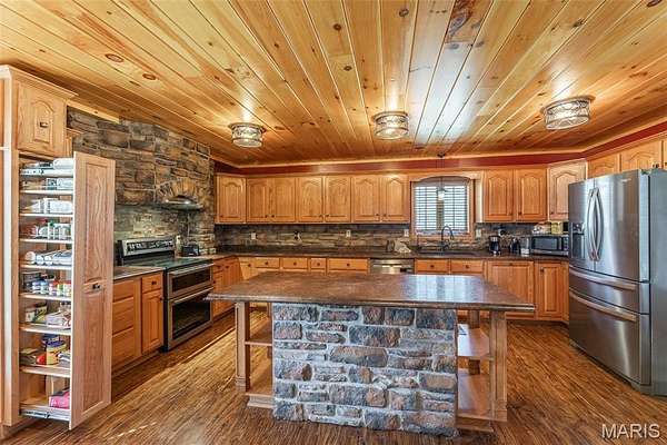 Step inside to find a fully renovated 3-bedroom, 3-bath layout featuring brand-new flooring, fresh paint, and two impressive floor-to-ceiling fireplaces that anchor the living spaces with warmth and character. The kitchen is a standout with custom oak cabinetry and beautiful stonework, creating a true country feel with upscale touches.