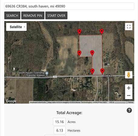 Welcome to this gorgeous ~ 15 acre parcel, less than 5 miles from Lake Michigan. This land is the perfect place for someone to call home, located 3 miles to downtown South Haven, 1 1/2 miles to the nearest golf course, and 1 mile to Maple Grove Elementary. There is easy access to major grocery stores (Meijer, Aldi, and Walmart), and just1 mile off M-43 for easy travel to and from Kalamazoo. The land being sold is the south east field of a 95 acre parcel on CR 384, which will need to be surveyed and divided.