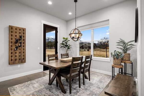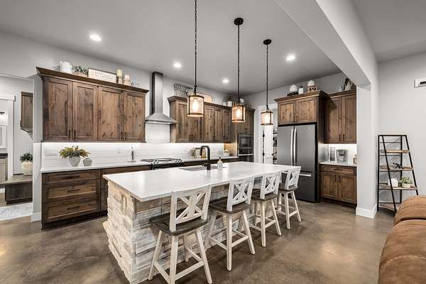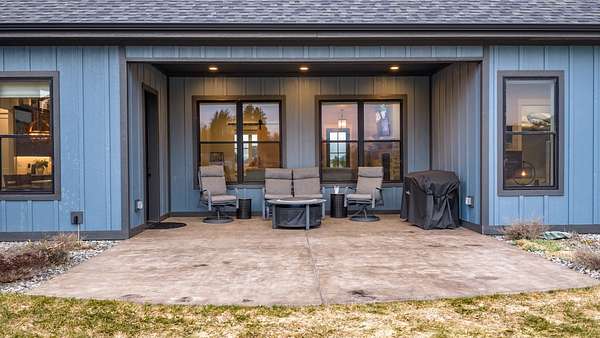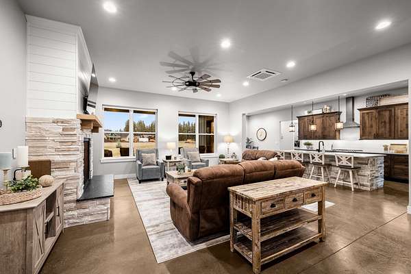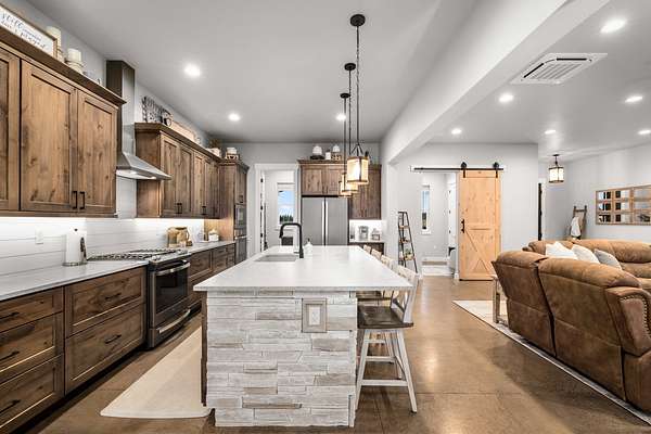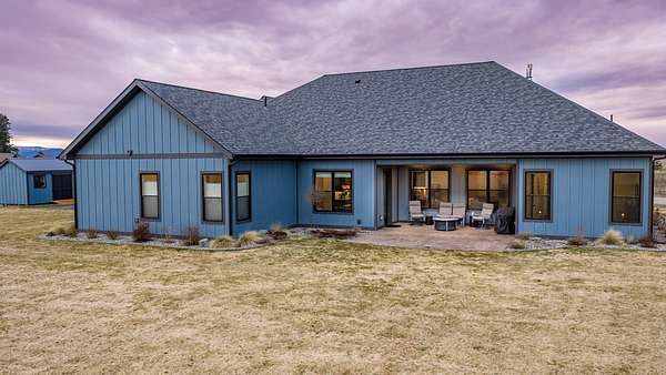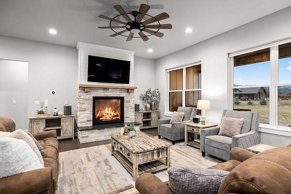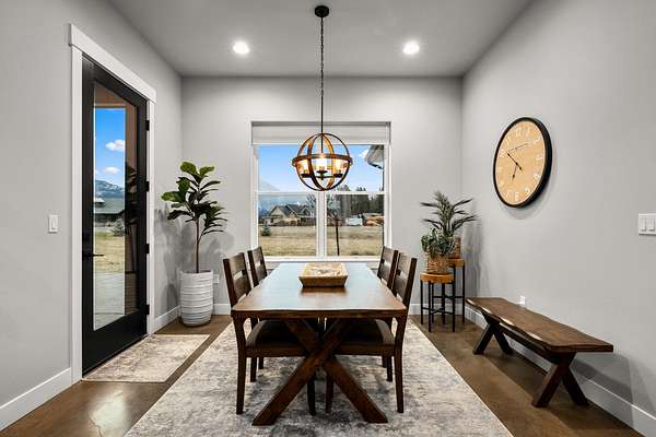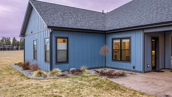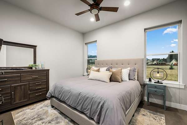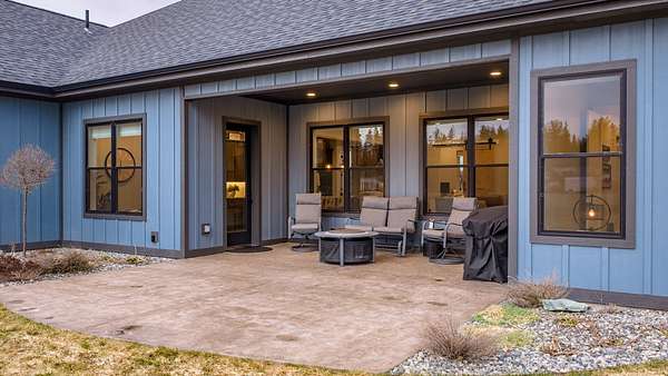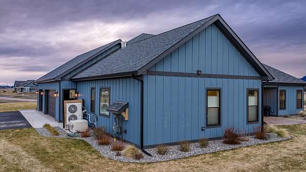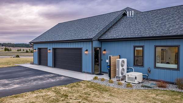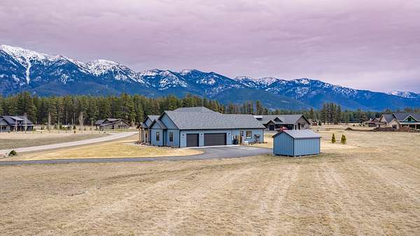 Experience the precision of high-efficiency construction in this 2,530-square-foot Kalispell home, situated on a 1.93-acre lot within the Sweetgrass Ranch community. Engineered for Montana's climate, the residence features 8-inch thick insulated walls utilizing Alaskan-style staggered-stud framing and a gas-fired radiant in-floor heating system that extends through both the living quarters and the expansive three-car garage. Polished concrete floors under 10-foot ceilings create a seamless, modern aesthetic, while 8-foot interior doors and 10-foot ceilings emphasize the open-concept layout. For individualized climate control, five ceiling-cassette mini-splits provide targeted cooling and supplemental heat throughout the home.The professional-grade kitchen is anchored by a massive stone-wrapped island and equipped for high-capacity entertaining with a gas range and and separate electric oven. A large walk-in butler's pantry provides extensive storage, complementing the custom cabinetry found in the adjacent laundry and mudroom areas. In the living area, oversized windows frame panoramic mountain views, centered by a stone-wrapped gas fireplace with shiplap accents. The primary suite offers a retreat with dual walk-in closets and a spa-inspired ensuite featuring a deep soaking tub and a separate glass-enclosed rain shower. Of the four bedrooms, one is specifically scaled for a versatile home office while retaining a dedicated closet. The property is fully equipped for modern self-sufficiency with a whole-house generator and fiber-optic internet wiring. Exterior features include stamped concrete sidewalks and a rear patio with a dedicated gas BBQ hookup. The 1.93-acre lot includes a 12x20 storage shed and an underground dripline irrigation system. Residents enjoy access to community paved walking trails and greenspace, with neighborhood covenants that specifically allow for the future construction of a shop.