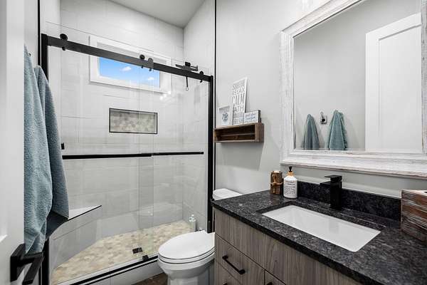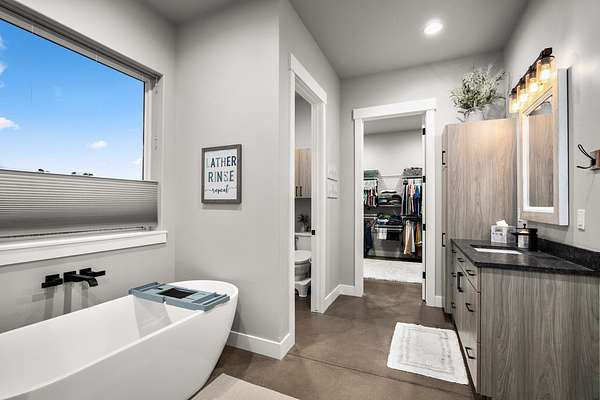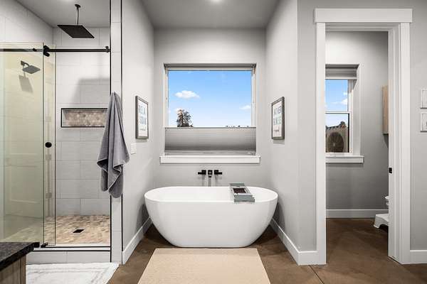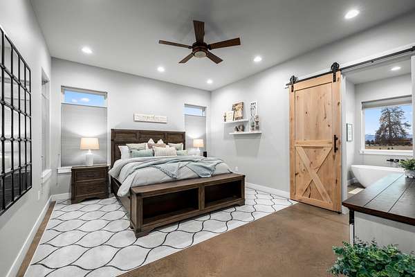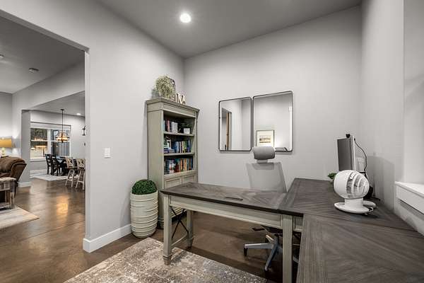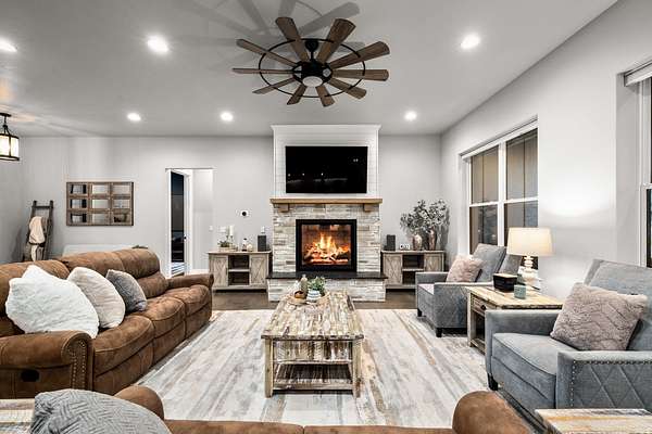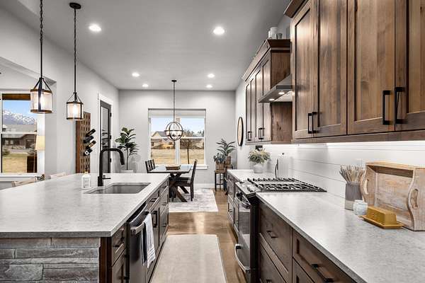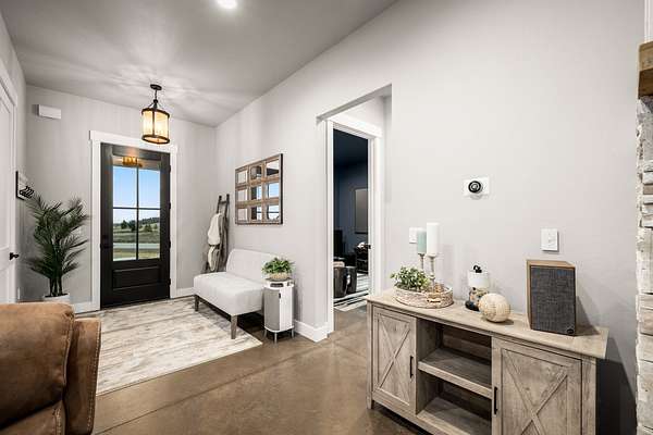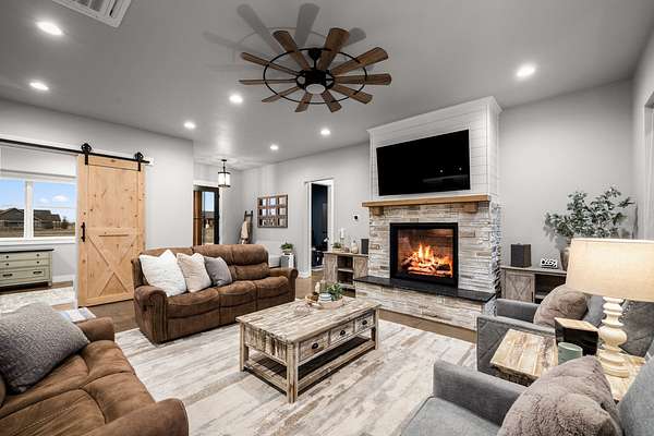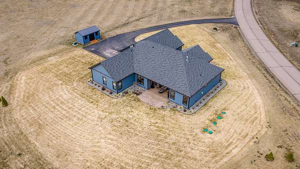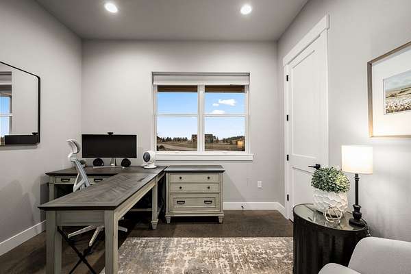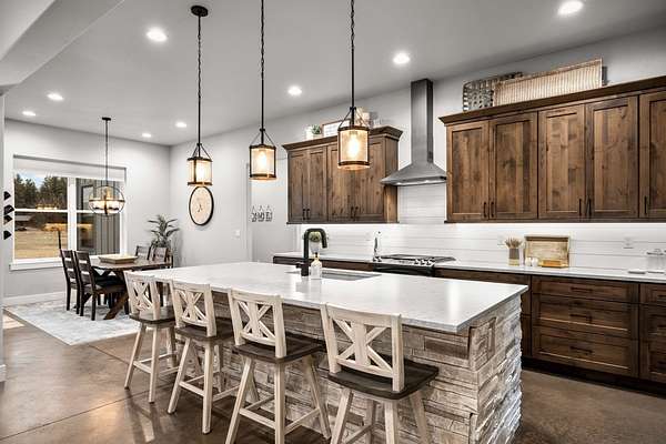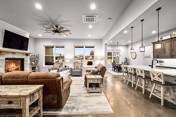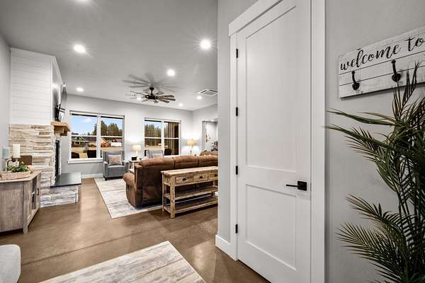 Experience the precision of high-efficiency construction in this 2,530-square-foot Kalispell home, situated on a 1.93-acre lot within the Sweetgrass Ranch community. Engineered for Montana's climate, the residence features 8-inch thick insulated walls utilizing Alaskan-style staggered-stud framing and a gas-fired radiant in-floor heating system that extends through both the living quarters and the expansive three-car garage. Polished concrete floors under 10-foot ceilings create a seamless, modern aesthetic, while 8-foot interior doors and 10-foot ceilings emphasize the open-concept layout. For individualized climate control, five ceiling-cassette mini-splits provide targeted cooling and supplemental heat throughout the home.The professional-grade kitchen is anchored by a massive stone-wrapped island and equipped for high-capacity entertaining with a gas range and and separate electric oven. A large walk-in butler's pantry provides extensive storage, complementing the custom cabinetry found in the adjacent laundry and mudroom areas. In the living area, oversized windows frame panoramic mountain views, centered by a stone-wrapped gas fireplace with shiplap accents. The primary suite offers a retreat with dual walk-in closets and a spa-inspired ensuite featuring a deep soaking tub and a separate glass-enclosed rain shower. Of the four bedrooms, one is specifically scaled for a versatile home office while retaining a dedicated closet. The property is fully equipped for modern self-sufficiency with a whole-house generator and fiber-optic internet wiring. Exterior features include stamped concrete sidewalks and a rear patio with a dedicated gas BBQ hookup. The 1.93-acre lot includes a 12x20 storage shed and an underground dripline irrigation system. Residents enjoy access to community paved walking trails and greenspace, with neighborhood covenants that specifically allow for the future construction of a shop.