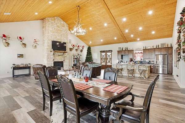 Welcome to an exceptional high-fence exotic ranch offering a rare blend of luxury living and premier hunting. This breathtaking property features rolling terrain with stunning views, abundant wildlife, and world-class outdoor recreation. The ranch is home to a variety of exotic animals, healthy populations of whitetail deer, and outstanding duck hunting, supported by numerous ponds strategically spread throughout the property. Whether you're an avid hunter or simply enjoy watching wildlife, this ranch delivers an unmatched experience. At the heart of the property sits a gorgeous main residence, offered fully furnished and designed for comfort and style. Perfect for entertaining or relaxing after a day outdoors, the home showcases quality finishes and scenic views in every direction. Additional improvements include a detached guest house and a private gym, providing ample space for family and guests. An additional guest cabin is currently under construction, along with a new cleaning barn, further enhancing the functionality and value of the ranch. With its beautiful scenery, exceptional hunting opportunities, and luxury accommodations, this one-of-a-kind ranch is ideal as a private retreat, family legacy property, or premier recreational investment. Another 120 acres also available, ask agent for details.