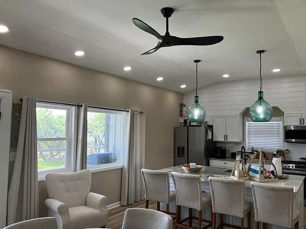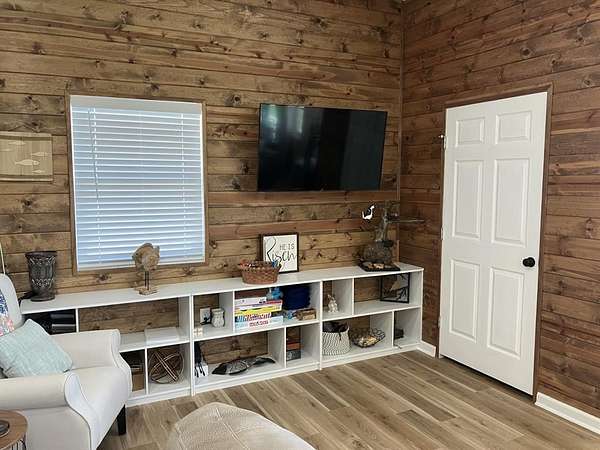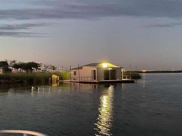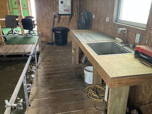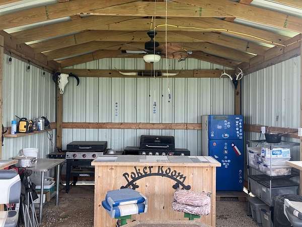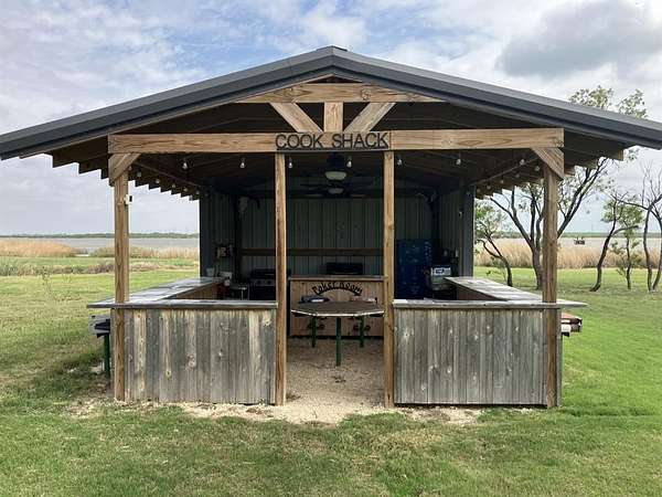 Built in 2024, the all-steel constructed cabin sits above both the flood plain and the emergency flood plain. The whole structure is treated with spray foam insulation. The cabin has three bedrooms and one full bath and comes furnished with beds, sofa, chairs, all appliances and other home furniture. The kitchen has gorgeous granite and marble countertops and stainless-steel appliances. Luxury vinyl flooring adorns the entire cabin. An outdoor private shower and an enclosed half bath on the front porch are available to clean up after playing all day. Designed for family entertainment and fun, plenty of lake shoreline is available for water play and a floating boat dock and indoor Crappie house sits just past the shallow canal of Bullrushes. A private boat launch is located north of the cabin for launching small boats. Well water is available at the cabin, cook shack and all structures. Sitting on a full five acres, this property offers enough space for atv or utv riding. There is also plenty of room for animals if desired.