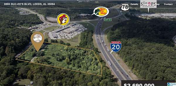 Est $19,234/moOutstanding Location adjacent to the Buc-cees in Leeds. Prime Commercial opportunity. Perfect for Commercial Developer or Investor. Commercial, Mixed use, multifamily are all options here. 2 Billboards on property. Leeds has announced economic partnerships with Sports Illustrated, US Steel, Teachers Retirement Systems of Alabama among others to drive economic development in this area. At this exit, proposed Regional sports park, 3 new hotels, and a Retail component to be owned by Retirement Systems of Alabama.