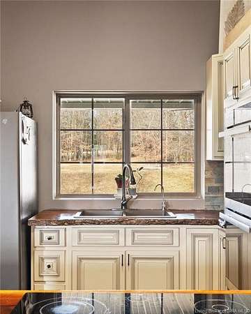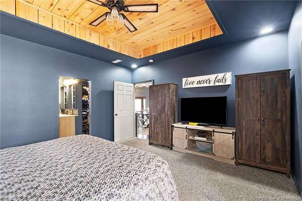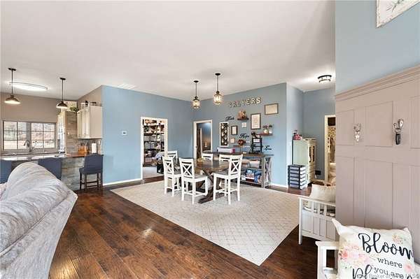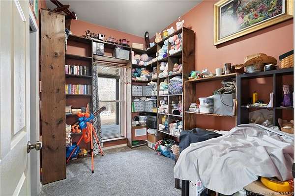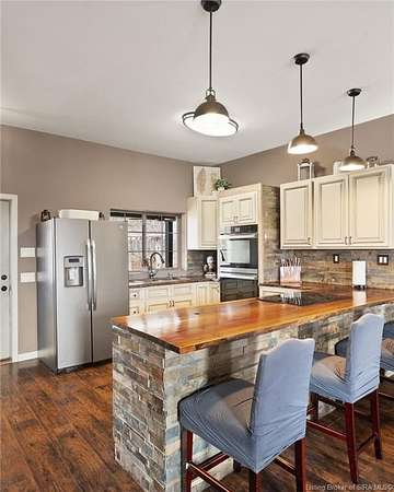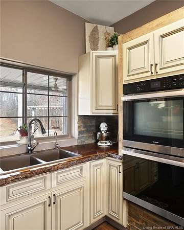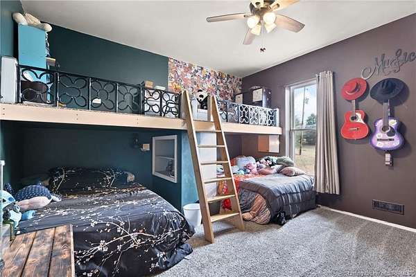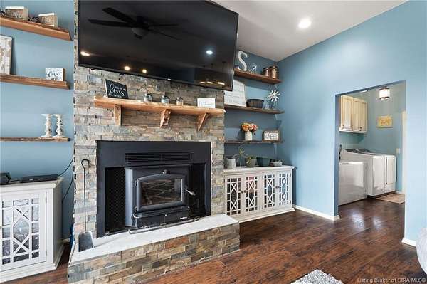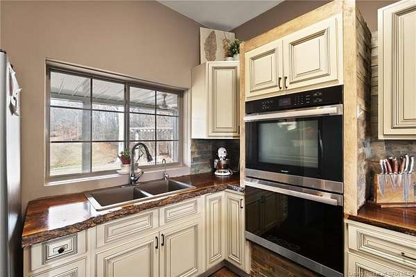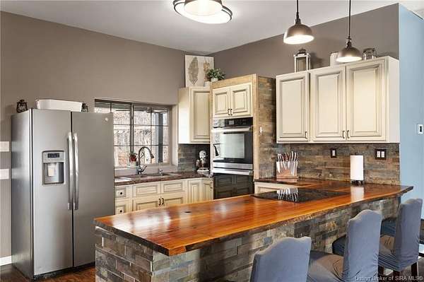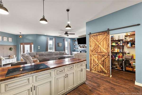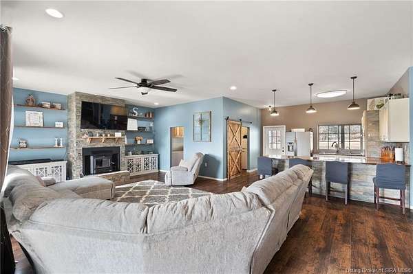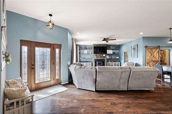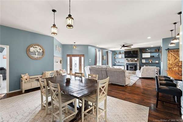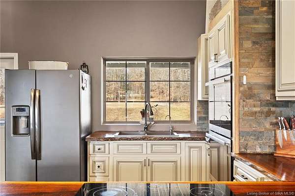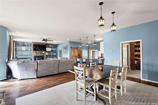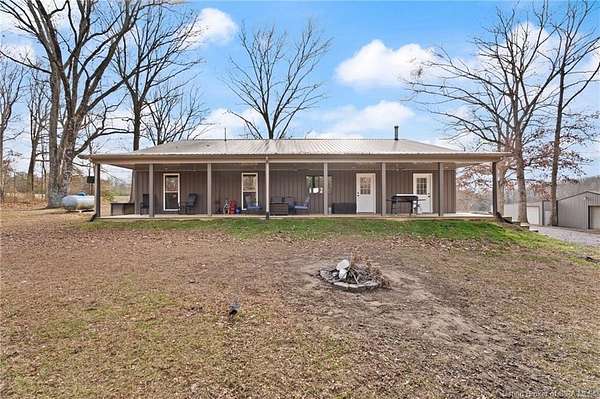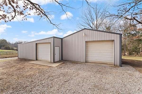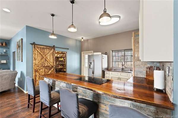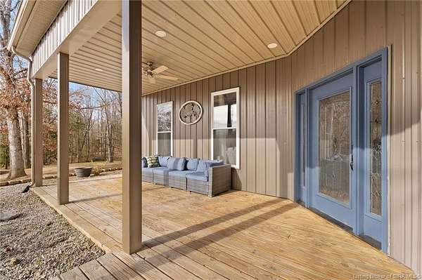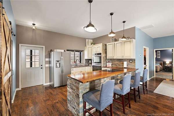 This custom built home, situated on 11.6 acres, offers serene surroundings with wooded views, a stocked pond, a creek, and wildlife to enjoy from covered front and back porches. This thoughtfully designed home features 2173 finished sq ft inside with 3300 sq ft under roof, a spacious living room with a cozy wood burning fireplace insert, custom surround and mantle. The open concept kitchen showcases walnut live edge countertops, custom cabinetry, stone accents, a slate sink, double oven, and a barn door leading to the pantry. The dining area provides ample space for gatherings and entertaining. The primary bedroom features a tray oak ceiling and a private en suite bathroom with board and batten detailing and luxury vinyl plank flooring. A secondary bedroom includes a loft area with custom built bookcases surrounding the closet. The fourth bedroom, with custom shelving, offers flexibility as a guest room, craft room, or home office. Additional features include walnut trimmed window sills, a laundry room with a feature wallpapered wall and custom cabinetry, a solid mahogany front door, and a tankless water heater. Outside, the pole barn garage includes a car lift (stays) and has space for vehicles, equipment, or recreational toys. The horse barn provides space for up to 7 horses, farm equipment, storage, or additional uses. Ideal for starting a mini farm or simply enjoying the land and lifestyle, this one of a kind property blends craftsmanship, function, and natural beauty.