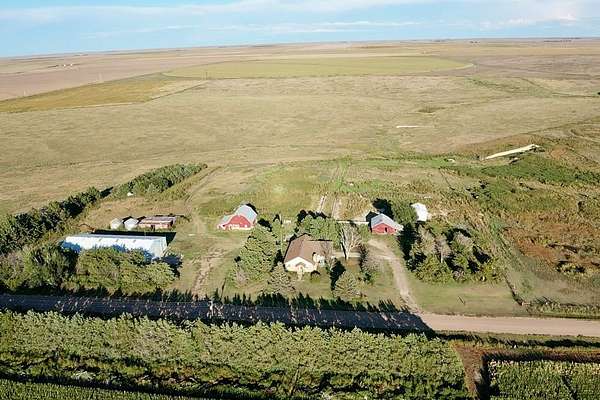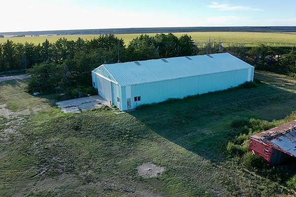 Multiple outbuildings for livestock and storage use as well as grain bins for onsite grain storage.