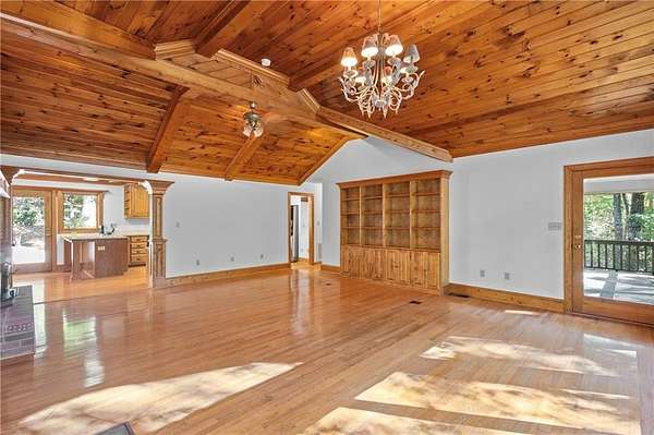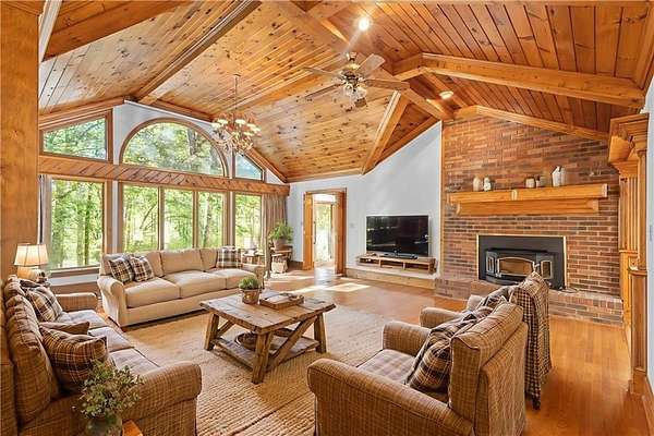 From the moment you step inside, you're greeted by a flagstone foyer featuring tongue-and-groove ceilings and custom millwork that immediately showcase the home's craftsmanship. The great room is the heart of the home, with soaring wood-beamed ceilings, a wall of windows, and spectacular views that flow seamlessly onto a large front porch -- the perfect place to relax and take in the natural beauty that surrounds you.