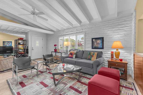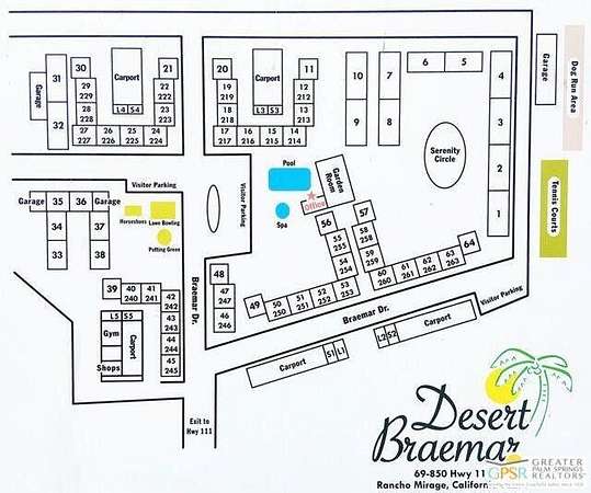 Rarely available and incredibly charming ''dollhouse'' boasting vaulted beamed ceilings, sleek tile flooring and custom features galore. The only unit of this type with 2 bathrooms. You'll love the plantations shutters, cozy outdoor living spaces, 3 skylights, built-in gas wall fireplace and original checkerboard ceiling design in the great room. Located in a quiet location, this one level home with no steps is close but not too close to the pool & spa. The newer mini-split HVAC system is perfect for lower utility bills plus you have your own interior washer & dryer. Each unit has a designated carport with storage above. Situated on over 12 acres Desert Braemar is a low density co-op community, called the 'hidden gem of the desert'. Every amenity is yours including pool/spa, gym, library, workshop, tennis/pickleball, putting green, lawn bowling, shuffleboard, clubhouse with amazing kitchen and terrace, on site manager M-F. Your co-op monthly fee includes all amenities, maintenance, water, sewer, trash, Spectrum high speed internet plus cable including HBO and Showtime AND YOUR PROPERTY TAXES! 55+ community. Desert Braemar is a Stock Cooperative and each owner is issued a 'stock certificate granting a specific number of shares of the complex with exclusive use of a particular unit. Cash sales only. Better hurry on this one before it gets away!