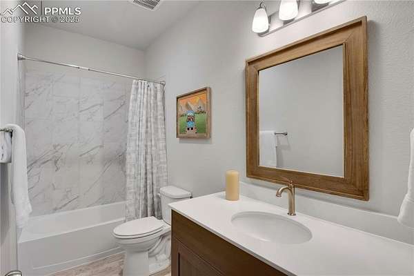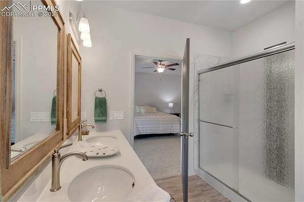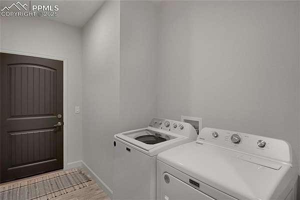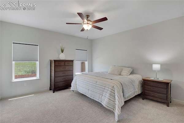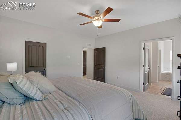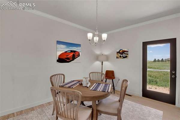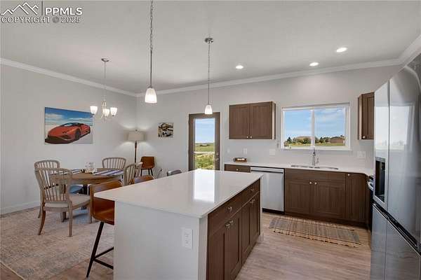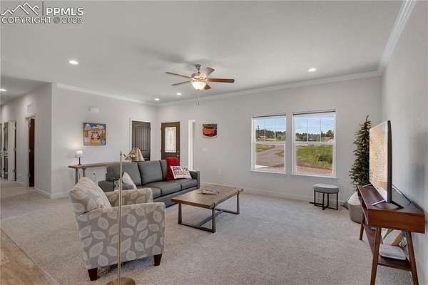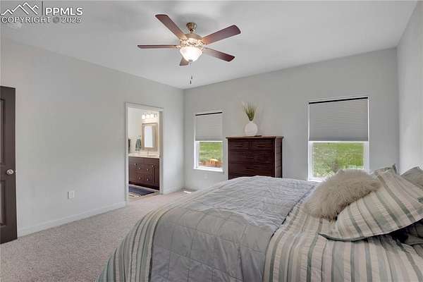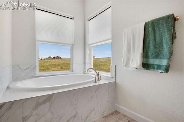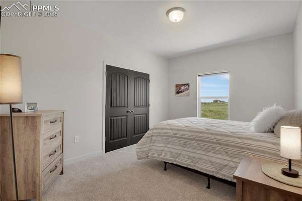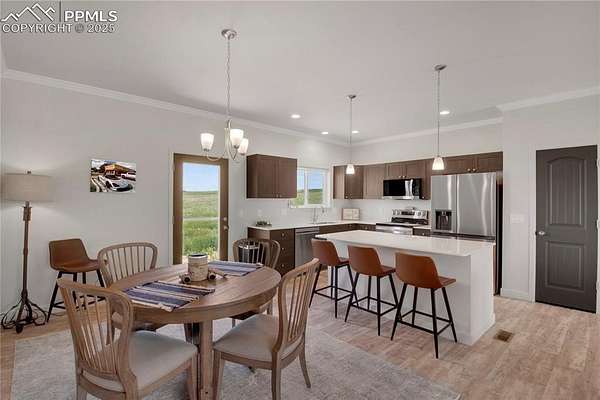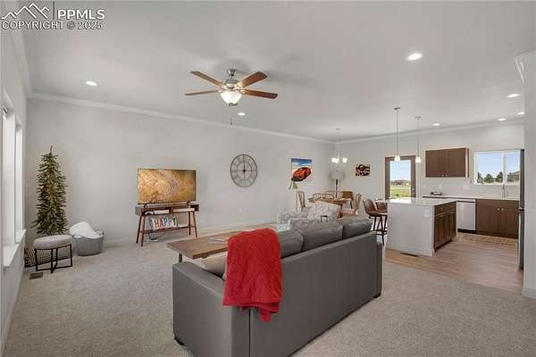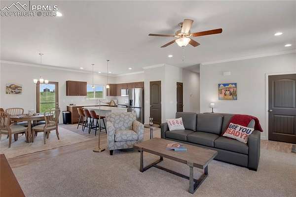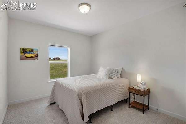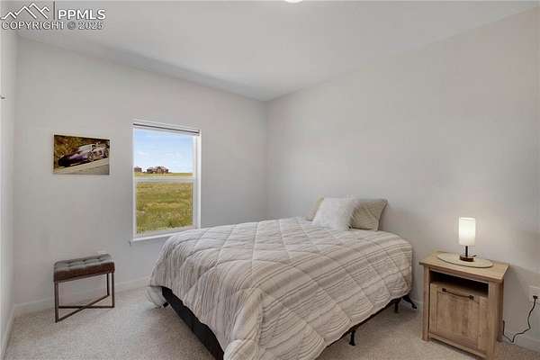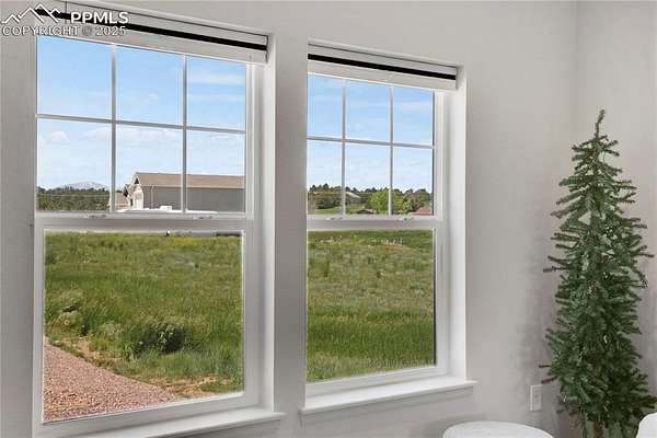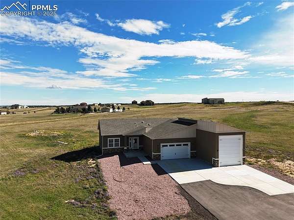 Welcome to this stunning 2024 custom ranch-style home, perfectly situated on 5.04 acres in highly sought-after Black Forest. Designed for effortless main-level living, this home features a brand-new asphalt driveway, a spacious 3-car garage with oversized RV bay. Step inside to 9' ceilings, crown molding, abundant natural light, and custom window treatments throughout. The open-concept layout flows seamlessly from the living room into the kitchen and dining area, creating a warm and welcoming space for everyday living or entertaining. The kitchen is beautifully appointed with quartz countertops, stainless steel appliances, a large center island, pantry, and rich brown cabinetry. The primary suite offers a luxurious retreat with an oversized shower, soaking tub, double vanity with quartz countertops, and private placement at the rear of the home. Two additional bedrooms offer ample closet space and share a full bathroom with granite countertops and a tiled shower/tub combo. A well-placed laundry/mudroom just off the garage adds everyday convenience. With no interior stairs and a new 2025 (propane) gas furnace, this home is designed for comfort, efficiency, and accessibility. Outside, take in wide open views and a stunning sightline to Pikes Peak. Whether you envision adding a barn, cultivating a garden, or simply enjoying the space and serenity, the possibilities are endless. With easy access to Black Forest Road, you're close to everything while enjoying the peace of acreage living. This is a rare opportunity to own a move-in ready home with modern finishes, open space, and true livability in one of Colorado's most desirable communities.