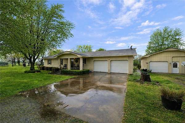 Charming and welcoming-this beautifully maintained 3-bedroom, 2-bath home offers the perfect blend of comfort and space, all set on 4.1 acres just off the highway for easy access and convenience. Featuring two spacious living areas, there's plenty of room to relax, entertain, or gather with family and friends. The property is ideal for those seeking a little extra room to spread out, with a barn, shed, and a fully finished detached garage/shop complete with electric and water-perfect for hobbies, projects, or additional storage. Enjoy the outdoors in the well-kept yard, offering endless possibilities for gardening, entertaining, or even starting your own hobby farm. The home's brick exterior and attached 2-car garage add both durability and curb appeal. This property truly offers convenient access with a feel of country living-don't miss your chance to make it yours! Listing agent related to seller.