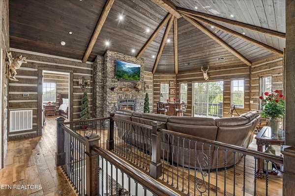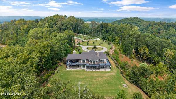 Experience unmatched privacy and luxury on this extraordinary 193-acre East Tennessee estate, tucked behind a mile-long driveway with underground utilities. Built in 2019, the nearly 4,000 sq. ft. main residence showcases custom craftsmanship throughout. Inside, you'll find 7-inch reclaimed hardwood floors, granite countertops, copper sinks, custom cabinets, stone accents, and arched iron entry doors. The main kitchen is designed for entertaining with Wolf appliances, a Sub-Zero refrigerator, a custom brick backsplash, a large sit-in island, walk-in food pantry, and tongue-and-groove beam ceilings. Downstairs, a second kitchen complements a living room with its own fireplace, three additional bedrooms, and an office. This level walks out to a covered patio and the backyard, creating seamless indoor-outdoor living. Three wood-burning fireplaces-two inside and one outdoors-add warmth and charm throughout the home, while seven double sliding doors with remote blinds flood the interiors with natural light and open to the covered terrace, deck space, and patio. Upstairs, the primary suite offers direct access to the deck with breathtaking mountain views, part of over 3,000 sq. ft. of combined outdoor living and deck space. The suite also includes a bathroom with a custom tiled walk-in shower, granite countertop, and walk-in closet. Additional features include a custom hardwood staircase, Aqua Pure water purification system, 500-gallon underground propane tank, tankless hot water heater, two Trane AC units, all LED lighting, surveillance system, and professional landscaping with a circle drive. Custom log siding and thoughtful stone accents give the home a timeless East Tennessee character. A separate 400 sq. ft. guest cabin mirrors the quality of the main home, featuring hardwood floors, custom kitchen cabinets, hardwood countertops, copper sinks, custom log siding with chinking, impact windows, spray foam insulation, covered porch, tankless hot water heater, and a Trane split AC + heat system-perfect for extended family or private retreats. The property also includes a 2,400 sq. ft. Hansen building with engineering drawings, 200-amp power, impact windows, and flexible use options. Outdoors, the land offers vineyards, a cross-buck fenced orchard with raised garden beds, ATV and hiking trails, and multiple building sites with stunning views. Located just 15 minutes from I-75 and 10 minutes to the Cherohala Skyway, this estate combines accessibility with complete seclusion. Whether envisioned as a private retreat, multi-generational homestead, or legacy property, 6999 New Hwy 68 delivers a one-of-a-kind opportunity.