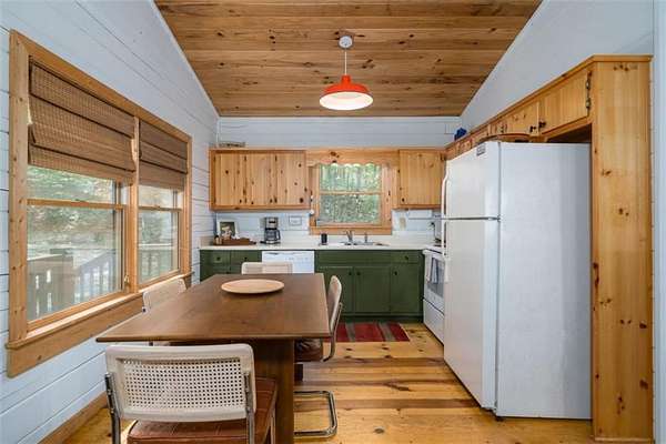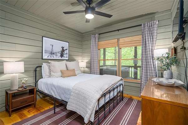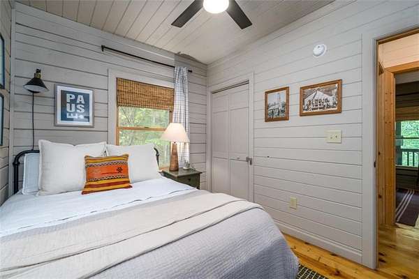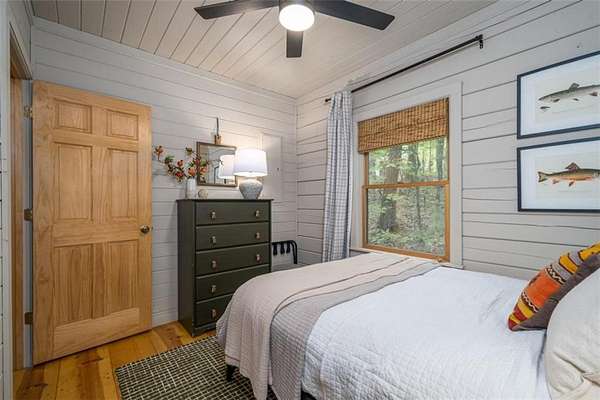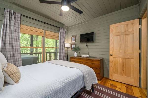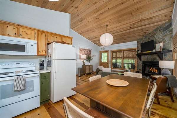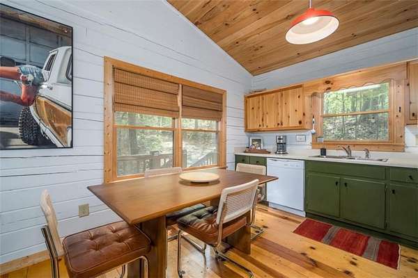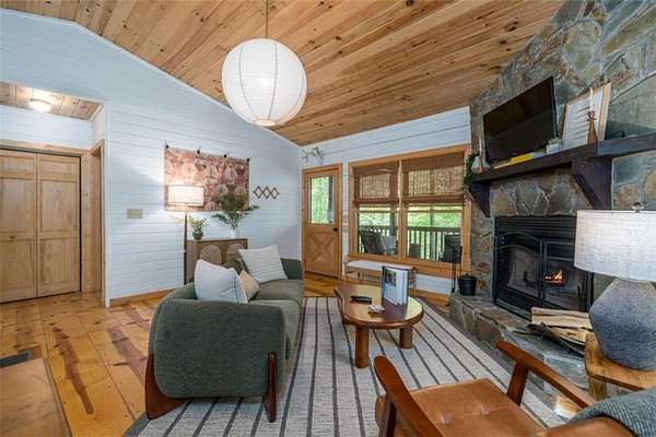 Freshly updated with new interior paint, stylish furnishings, and curated accessories, The Wildwood House is the perfect blend of rustic charm and stylish, modern comfort. Nestled on a serene 1.5+ acre corner lot in the scenic Cherry Lake subdivision, this true-log cabin invites you to unwind in style. Step inside to find a warm, inviting great room wrapped in rich tongue-and-groove wood finishes and anchored by a cozy, wood-burning fireplace - perfect for snuggling up on chilly mountain nights. The open-concept kitchen, featuring cheerful green cabinetry and modern appliances, flows seamlessly into a dining area with seating for four, making entertaining easy and relaxed. With 2 bedrooms, a full bath, and a laundry closet all on one level, the layout is smart and efficient-ideal for low-maintenance living or hosting guests comfortably. The bedrooms have been color drenched in soothing mountain tones to keep the rustic warmth yet still being modern. Step outside and embrace the mountain lifestyle on the expansive wrap-around porch. Soak your cares away in the private hot tub while listening to the sounds of nature or gather around the firepit under the stars with friends and family. Adirondack chairs, fireflies, and the peacefulness of the woods create the ultimate North Georgia experience. Located between the vibrant mountain towns of Blue Ridge and Ellijay, you're perfectly positioned for outdoor adventures like hiking and biking, visits to local wineries, or exploring boutique shops and farm-to-table dining. This turn-key cabin is ready for whatever you envision-whether it's a money-making investment, your weekend getaway, or a peaceful full-time home. Don't miss your chance to own this refreshed, rustic-meets-modern retreat. The Wildwood House is calling-come see it today!