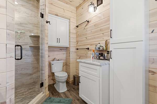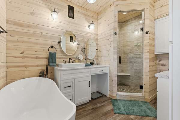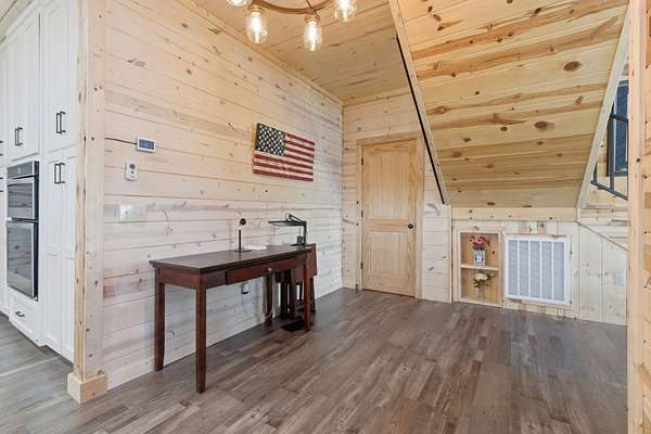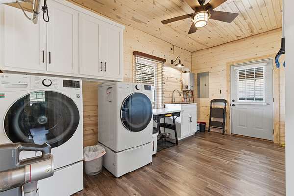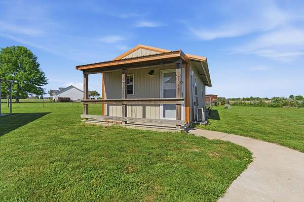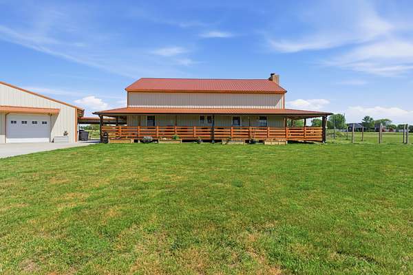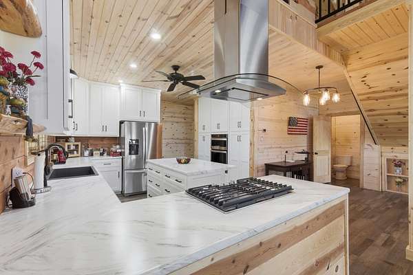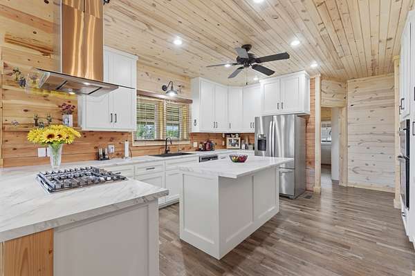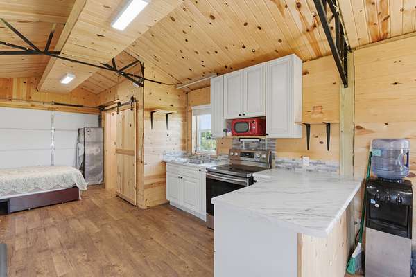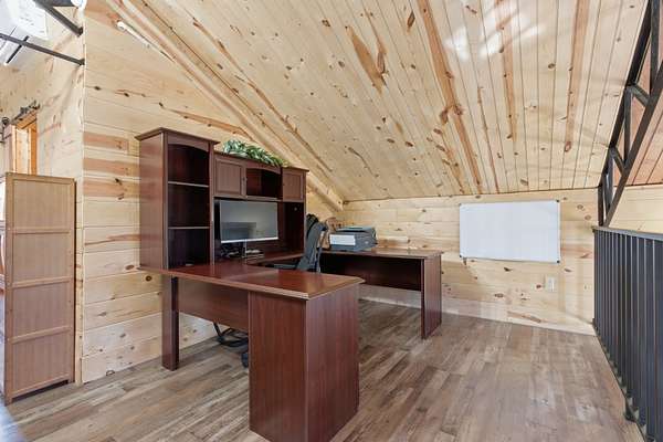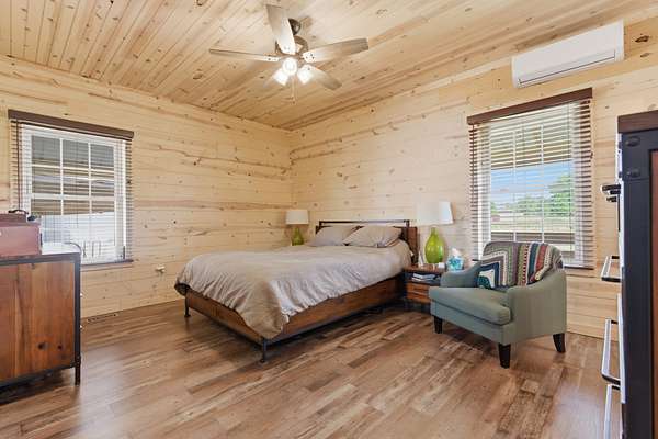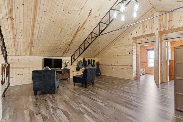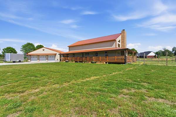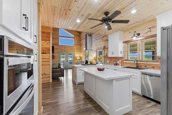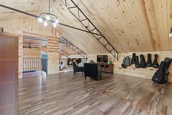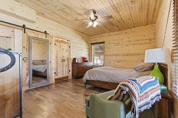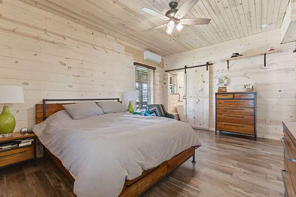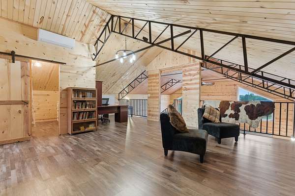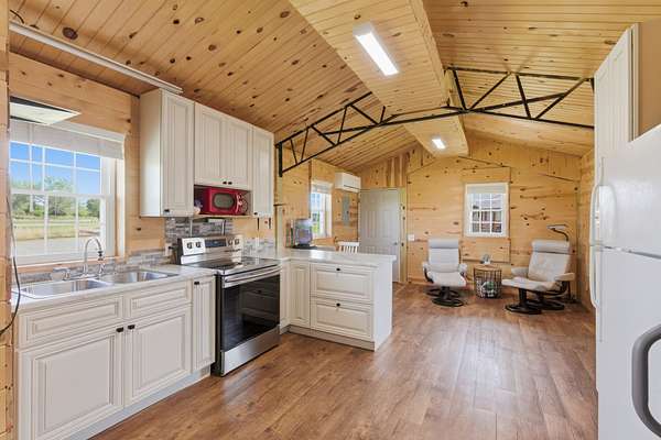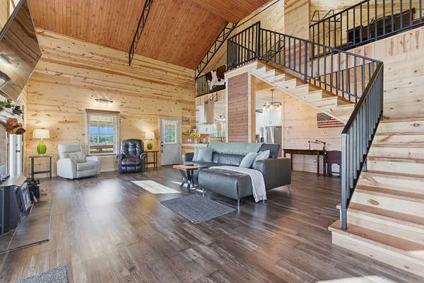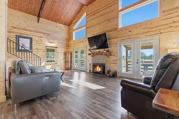 Showstopper custom build on 2.9 acres! This fully fenced property delivers privacy, versatility, and income potential with a detached ADU featuring full bath, full kitchen, and laundry—perfect for guests, rental, or multigenerational living. Inside the main home, enjoy an open-concept layout with soaring 20-ft ceilings, a dramatic wood-burning fireplace, and warm tongue-and-groove finishes throughout.