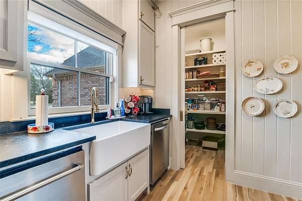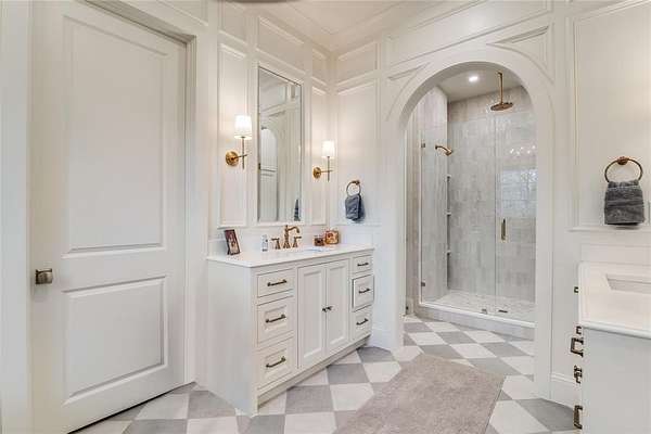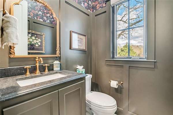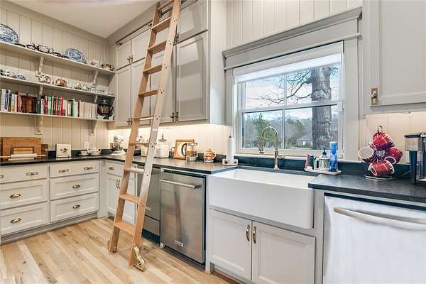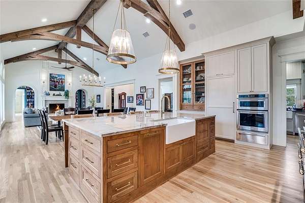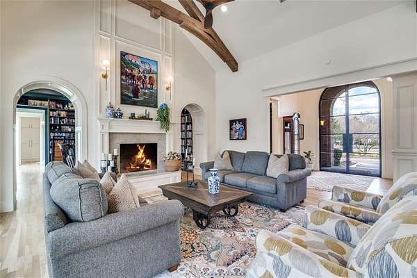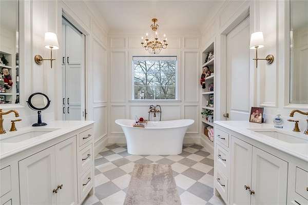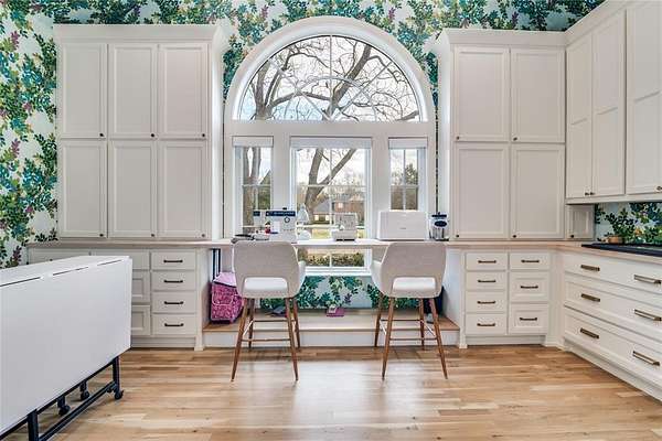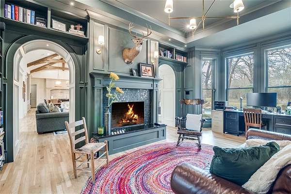 The home features two full kitchens with all new premium appliances, including a commercial range, three ovens, three dishwashers, ice maker, warming drawer, pot filler, column refrigerator and freezer, and a built in refrigerator. Custom cabinetry and new countertops continue throughout both kitchens, the laundry room, primary bath, and craft room, creating a seamless and sophisticated design. Natural light pours in through Pella windows with custom shades, while a dramatic see through fireplace anchors the living spaces. A built-in library with picture frame molding and custom bookshelves offers a cozy, yet refined retreat, complemented by designer wallpaper and tile selections throughout.