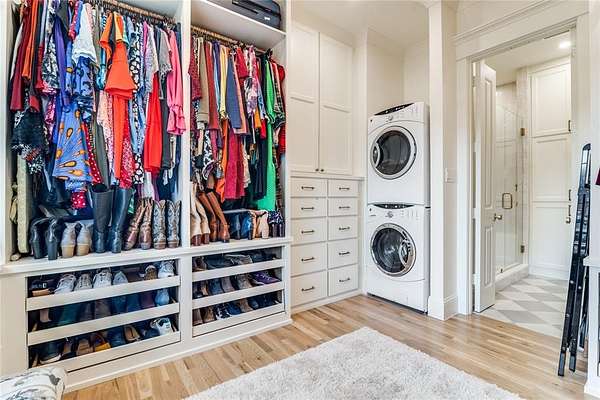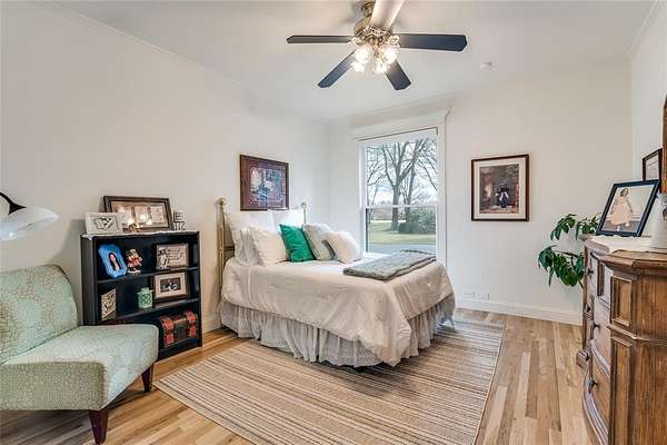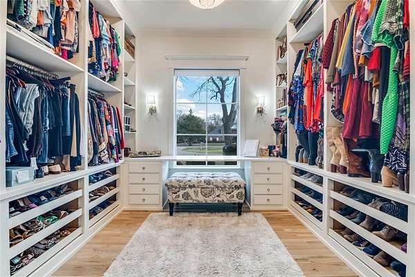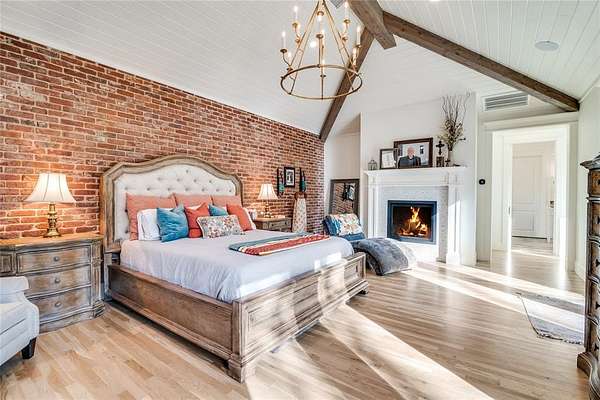 The primary suite is a true sanctuary, featuring its own fireplace, a spa-like bath with a soaking tub, oversized shower, picture frame molding, and a generous walk in closet with shoe drawers and laundry hookups.