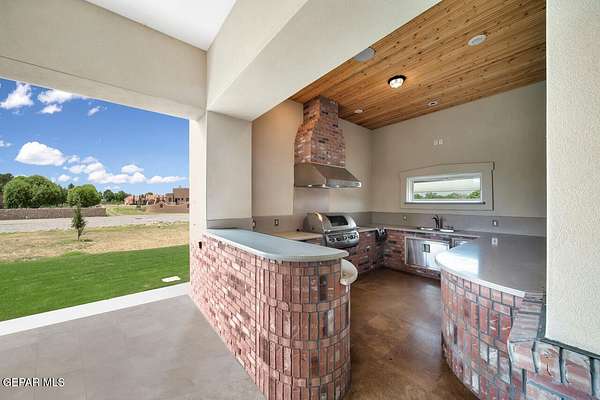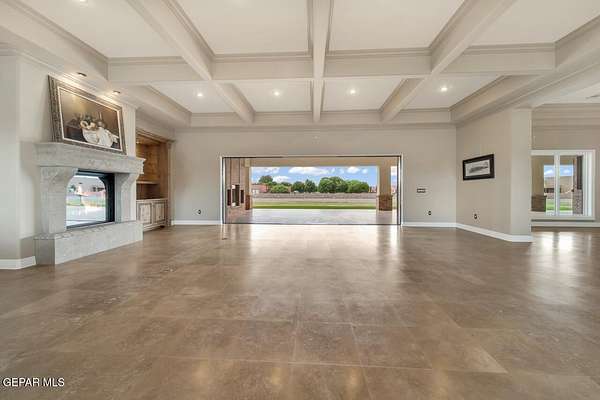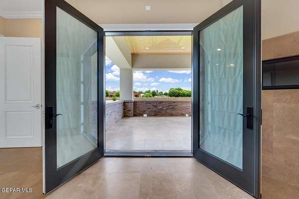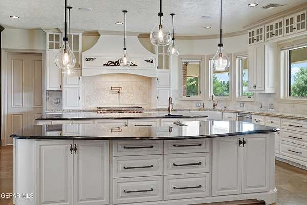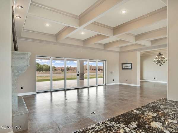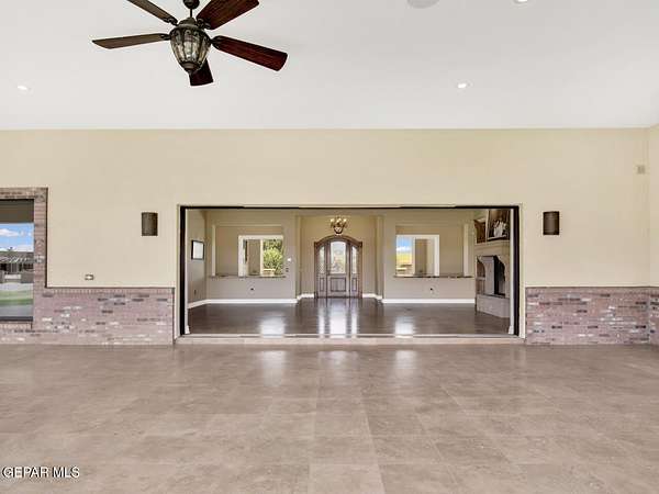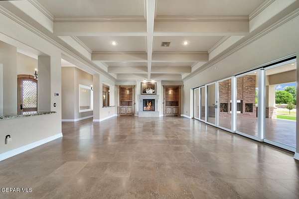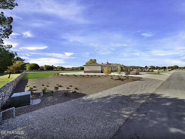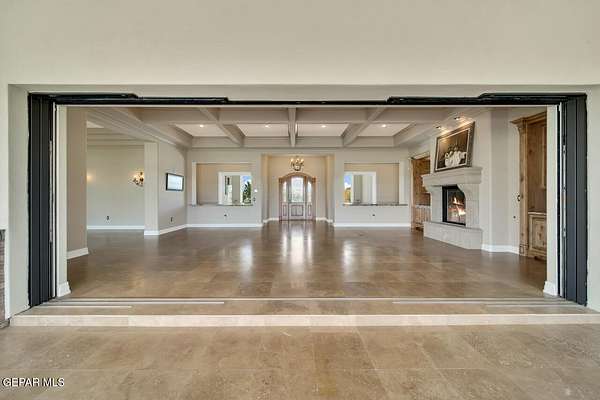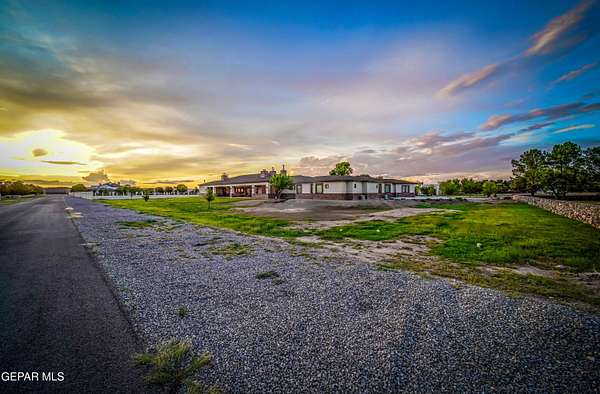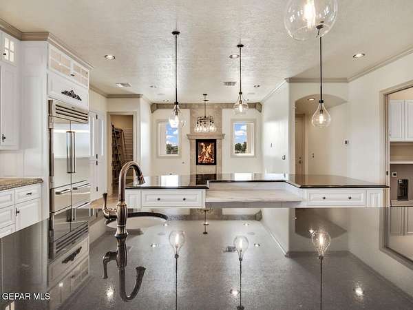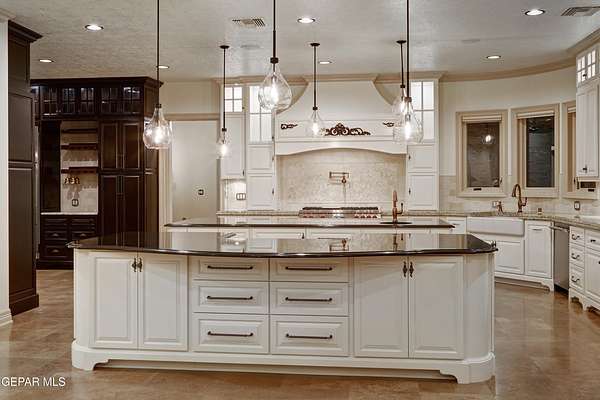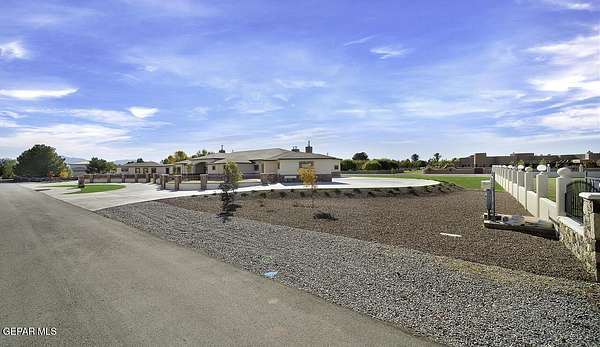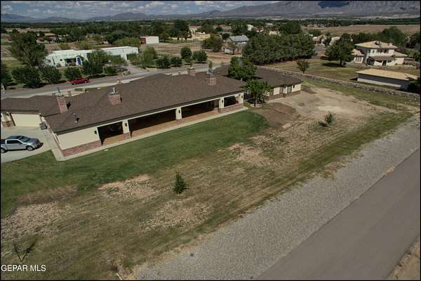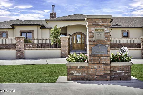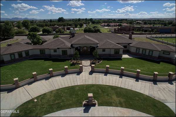 Nestled within the private fly-in community of Cielo Dorado Estates, this 1-story custom home sets the standard for luxury living. Crafted with meticulous attention to detail, it offers a perfect fusion of elegance and comfort. The grand living room exudes sophistication with its custom cabinetry, limestone fireplace, and high coffered ceilings. The expansive disappearing doors effortlessly connect the interior with the vast covered patio, creating a seamless indoor-outdoor experience. The dream kitchen is a culinary masterpiece, boasting top-of-the-line appliances. Two generously sized granite-topped islands, and an exceptional pantry, cater to your every culinary need. The primary retreat is extraordinary, with a luxurious bathroom that will leave you in awe. Outside, there's ample space for an airplane hangar. And here's the bonus - the solar panels have reduced the electric bills to ZERO for 2023, making this property not just luxurious but also environmentally conscious. Located in one of the few fly-in communities in the country, the epitome of luxury living in the coveted gated subdivision of Cielo Dorado Estates, sits this one story custom home on 1.83 acres and just minutes away from El Paso. The masterfully built one story home offers you 8,036 square feet of living space, 2 living areas of which one can be used as a game room/theater room, a study/library, five great size bedrooms, each with its own deluxe bathroom, a powder room and so much more to enjoy. As you approach the home, you'll be captivated by its symmetry. Designed with a grand entry, the large wrought iron gates invite you up the front porcelain walk to the impressive, custom built door with leaded glass. The home offers you spectacular interior finishes as well as endless entertaining possibilities. Once inside, you will truly appreciate the elegant yet comfortable spaces. The home features a grand living room with custom cabinetry, striking limestone fireplace, high coffered ceilings, disappearing doors that span across the room and seamlessly open to the expansive outdoor living space. This patio gives you over 2,100 square feet of outdoor entertaining on a large scale. It is complete with a wood burning fireplace, as well as an incredible outdoor kitchen and bar area with the finest of appliances that add to your indoor/outdoor living experience. Back inside and located between the living room and the kitchen, you'll find the dining room with a gorgeous chandelier hanging overhead. It has plenty of space for all of your formal dining room furniture and seating for over twenty guests for holiday gatherings. Adjacent to the formal dining room is the gourmet kitchen which is sure to delight the most discriminating chef. It showcases top of the line stainless steel Wolf and Sub Zero appliances, two large islands covered with beautiful granite counter tops, a stunning butler's pantry, an additional walk-in pantry, as well as a breakfast nook with a gorgeous fireplace. You'll love the extras in the kitchen as well. You'll find a beverage center that protects up to 146 bottles of your favorite wine, a Thermador coffee and cappuccino station, touch to turn on faucets, warming drawers, a microwave, a pot filler over the six-burner Wolf stove, and a Dutch door that leads to the outdoor kitchen. You'll also love the vegetable sink located in the center island, remote controlled blinds, as well as the numerous recessed can lights in the ceiling that illuminate the kitchen and help you show off the luxury in which you live. The primary retreat is exquisite. It is where you will want to retire to at the end of a long day. It offers a fireplace for ambiance as well as a private patio. The luxurious amenities in the large primary bathroom are sure to amaze you. It is complete with a jetted tub, separate shower, custom cabinetry, travertine counter tops, his and hers vanities, toilets, and closets, which are both as large as most bedrooms and feature custom cabinet