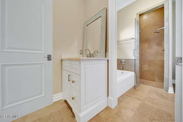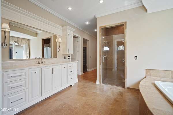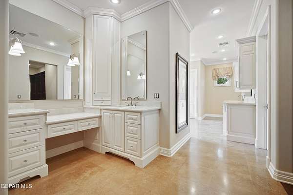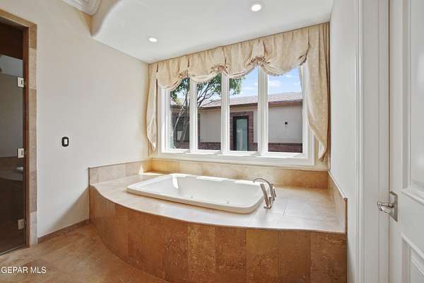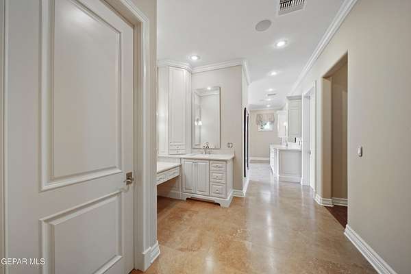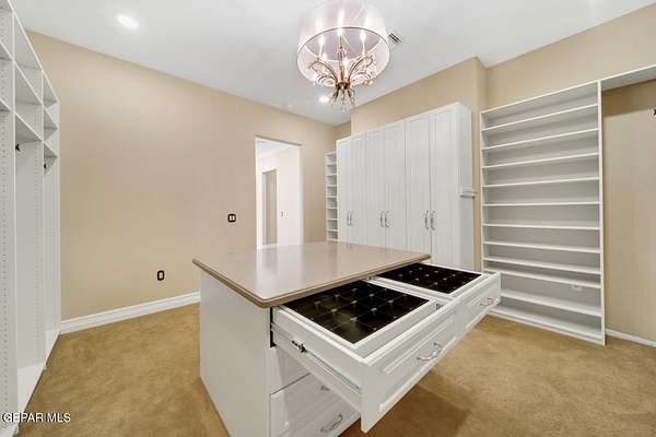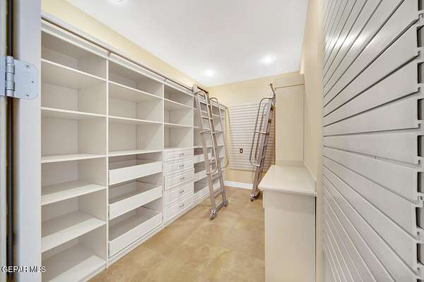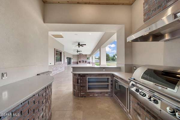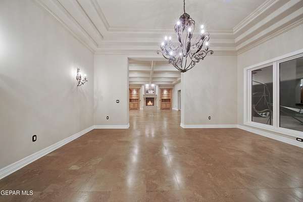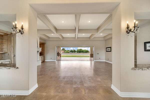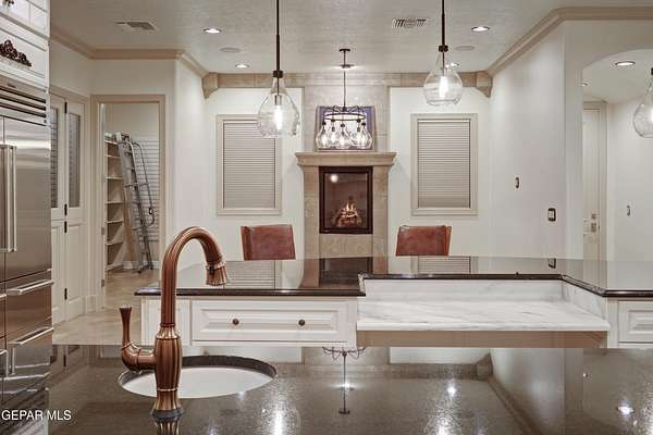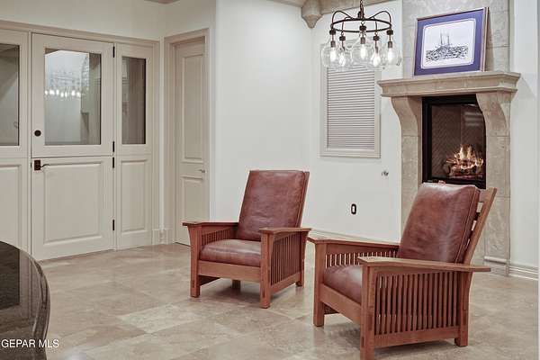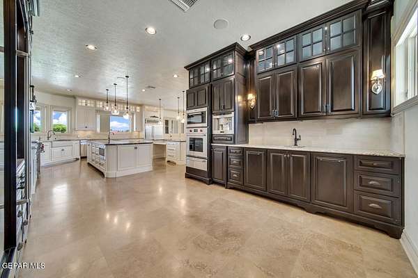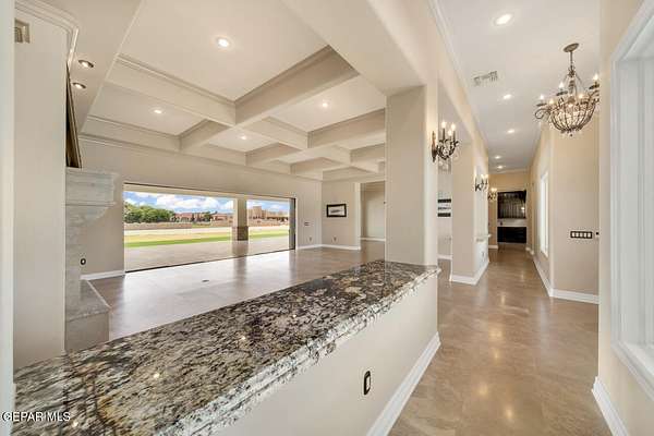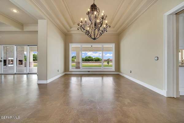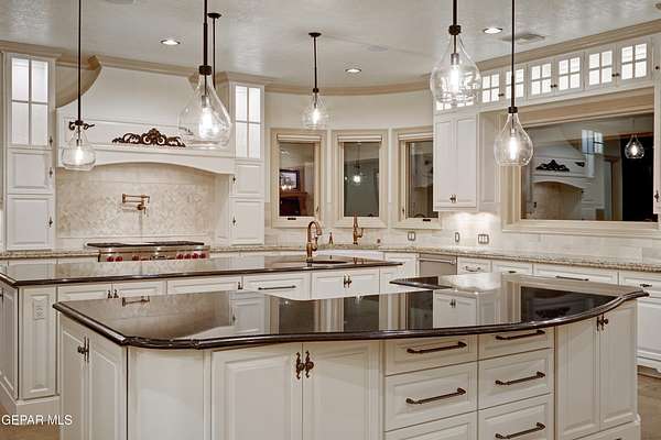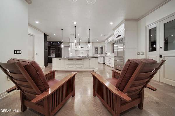 Nestled within the private fly-in community of Cielo Dorado Estates, this 1-story custom home sets the standard for luxury living. Crafted with meticulous attention to detail, it offers a perfect fusion of elegance and comfort. The grand living room exudes sophistication with its custom cabinetry, limestone fireplace, and high coffered ceilings. The expansive disappearing doors effortlessly connect the interior with the vast covered patio, creating a seamless indoor-outdoor experience. The dream kitchen is a culinary masterpiece, boasting top-of-the-line appliances. Two generously sized granite-topped islands, and an exceptional pantry, cater to your every culinary need. The primary retreat is extraordinary, with a luxurious bathroom that will leave you in awe. Outside, there's ample space for an airplane hangar. And here's the bonus - the solar panels have reduced the electric bills to ZERO for 2023, making this property not just luxurious but also environmentally conscious. Located in one of the few fly-in communities in the country, the epitome of luxury living in the coveted gated subdivision of Cielo Dorado Estates, sits this one story custom home on 1.83 acres and just minutes away from El Paso. The masterfully built one story home offers you 8,036 square feet of living space, 2 living areas of which one can be used as a game room/theater room, a study/library, five great size bedrooms, each with its own deluxe bathroom, a powder room and so much more to enjoy. As you approach the home, you'll be captivated by its symmetry. Designed with a grand entry, the large wrought iron gates invite you up the front porcelain walk to the impressive, custom built door with leaded glass. The home offers you spectacular interior finishes as well as endless entertaining possibilities. Once inside, you will truly appreciate the elegant yet comfortable spaces. The home features a grand living room with custom cabinetry, striking limestone fireplace, high coffered ceilings, disappearing doors that span across the room and seamlessly open to the expansive outdoor living space. This patio gives you over 2,100 square feet of outdoor entertaining on a large scale. It is complete with a wood burning fireplace, as well as an incredible outdoor kitchen and bar area with the finest of appliances that add to your indoor/outdoor living experience. Back inside and located between the living room and the kitchen, you'll find the dining room with a gorgeous chandelier hanging overhead. It has plenty of space for all of your formal dining room furniture and seating for over twenty guests for holiday gatherings. Adjacent to the formal dining room is the gourmet kitchen which is sure to delight the most discriminating chef. It showcases top of the line stainless steel Wolf and Sub Zero appliances, two large islands covered with beautiful granite counter tops, a stunning butler's pantry, an additional walk-in pantry, as well as a breakfast nook with a gorgeous fireplace. You'll love the extras in the kitchen as well. You'll find a beverage center that protects up to 146 bottles of your favorite wine, a Thermador coffee and cappuccino station, touch to turn on faucets, warming drawers, a microwave, a pot filler over the six-burner Wolf stove, and a Dutch door that leads to the outdoor kitchen. You'll also love the vegetable sink located in the center island, remote controlled blinds, as well as the numerous recessed can lights in the ceiling that illuminate the kitchen and help you show off the luxury in which you live. The primary retreat is exquisite. It is where you will want to retire to at the end of a long day. It offers a fireplace for ambiance as well as a private patio. The luxurious amenities in the large primary bathroom are sure to amaze you. It is complete with a jetted tub, separate shower, custom cabinetry, travertine counter tops, his and hers vanities, toilets, and closets, which are both as large as most bedrooms and feature custom cabinet