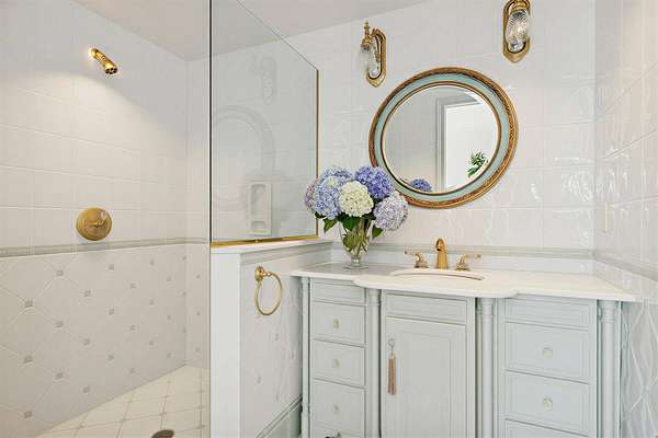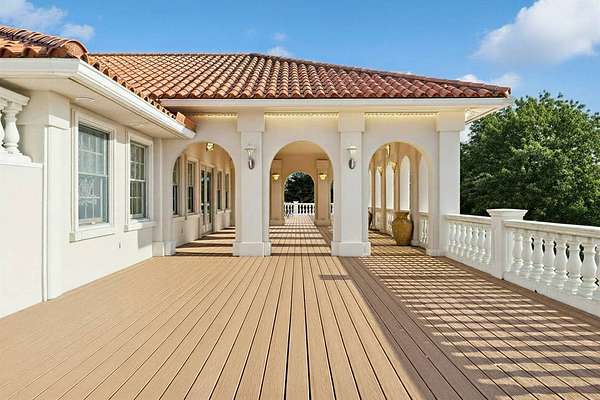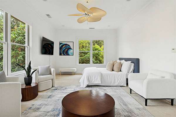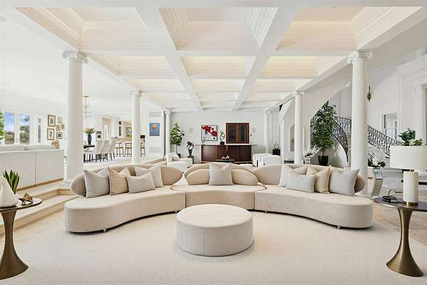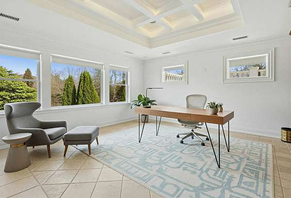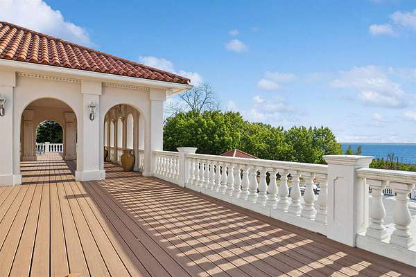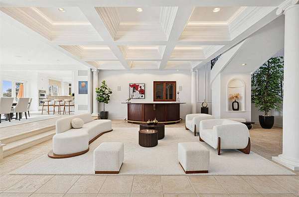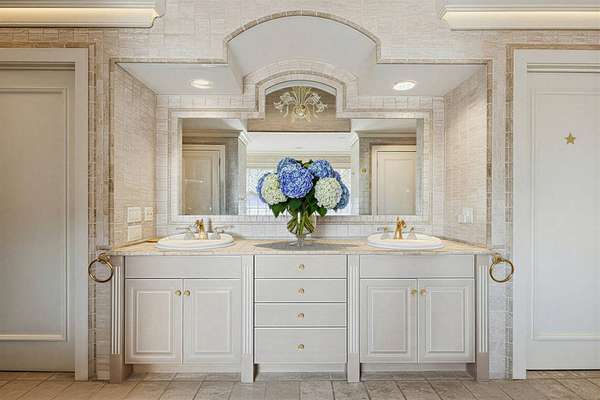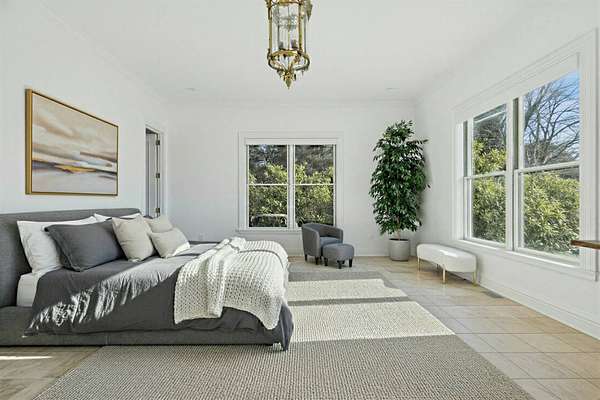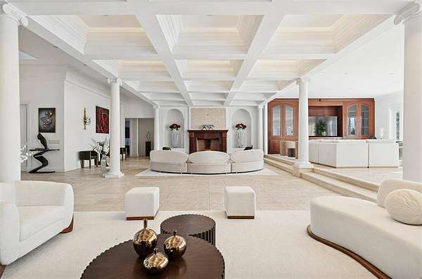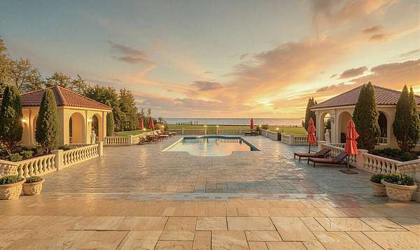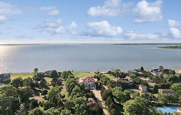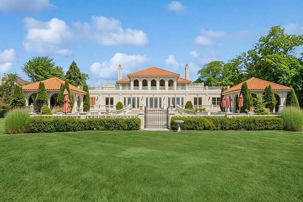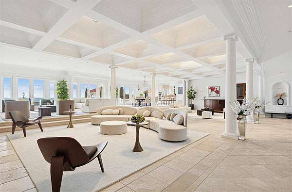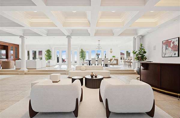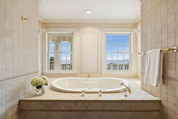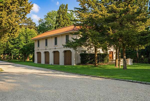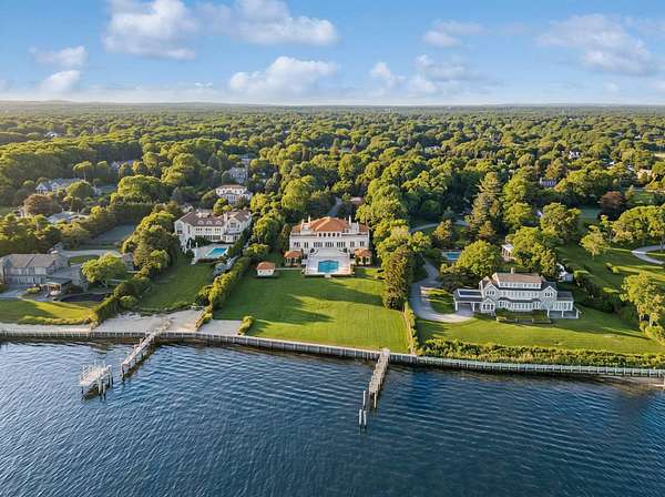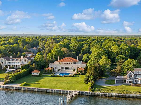 Privately set behind gates on one of Remsenburg's most coveted lanes, this exceptional waterfront estate offers approximately 175 feet of pristine bulkheaded frontage along Moriches Bay, capturing breathtaking sunset views and an unparalleled sense of serenity. Spanning approximately 8,250 square feet, the Mediterranean-inspired residence is constructed with remarkable integrity, reinforced with steel beams throughout, and thoughtfully designed for both grand entertaining and effortless resort-style living. A dramatic grand salon serves as the heart of the home, featuring soaring coffered ceilings, a wood-burning fireplace, custom bar, and multiple seating areas-all seamlessly opening through French doors to the waterfront grounds. The chef's kitchen, appointed with granite countertops and an oversized island, flows into the dining area, while the main level also includes four en-suite guest bedrooms, a flexible gym or wellness space, sauna, and powder room. The entire second level is devoted to a private primary retreat, complete with a fireplace, study, bespoke dressing rooms, and a spa-caliber bath with steam shower and soaking tub. A 35-foot covered terrace overlooks the pool, cabanas, and sweeping bay views. Outdoors, the estate transforms into a true waterfront sanctuary with a 25' x 45' heated gunite pool, two open-air cabanas, expansive manicured lawns, and a private sandy beach area. A fully equipped dock with floating slips, water, and electric completes this rare offering for boating enthusiasts. Additional amenities include an approximately 3,000 square foot carriage house with a four-car garage and a two-bedroom guest or staff residence above, as well as a separate three-car garage and service bay at the main residence. Now reintroduced to the market, this is a rare opportunity to own a generational waterfront estate defined by scale, privacy, and enduring craftsmanship.