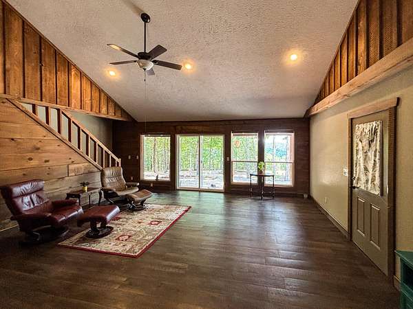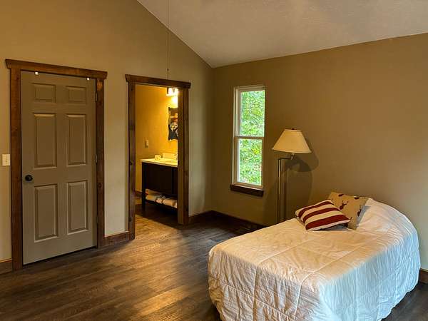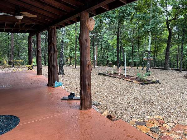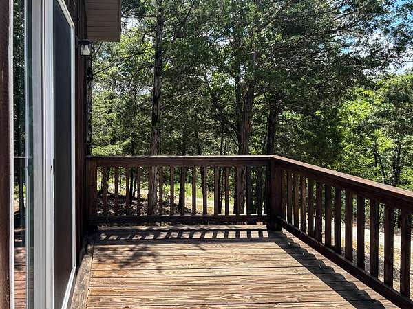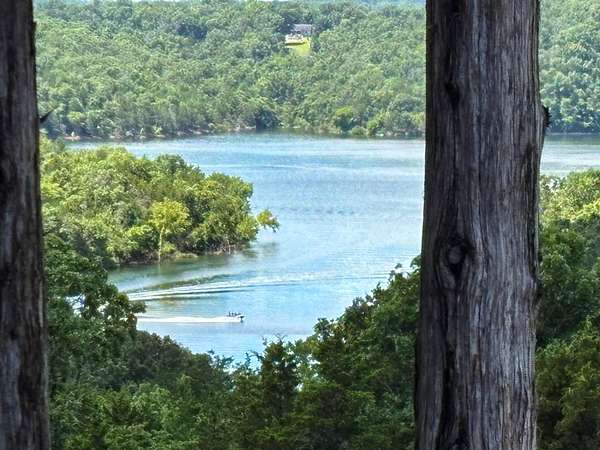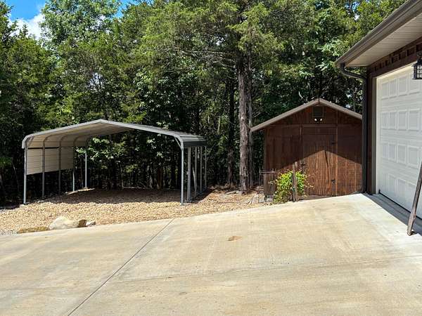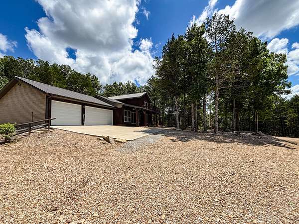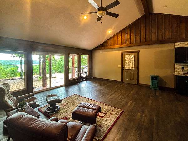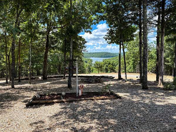 This 3 bedroom, 3 bath home sits on 6 lots in Country Club Hills, was built in 2019, has 1490 sq. ft. of living space, a 3 car attached garage, a metal roof, lots of privacy, and a fulltime view of Bull Shoals Lake. The 1.5 story home has a master bedroom on each level. The lower master had a sliding patio door going to a covered patio across the entire front of the house and the upstairs master has a sliding patio door leading out to a 16x8 deck. Both masters have fantastic lake views!! An additional bonus room upstairs could be used as an office or become the 4th bedroom (non-conforming). The kitchen does have a pantry and the cathedral ceilings with large wooden beams in the kitchen and living room areas give you that warm lake house feeling. An additional bedroom, a nice utility room, and a full bathroom are on this level as well. Outside, where you will spend the most of your time, is a firepit, a 12x16 storage building, and a 20x20 carport. With a rock lawn, there is no grass to cut and maintenance is very low. Who wants to be at the lake and have to do yard work anyway? Grass belongs on a golf course, which by the way...is just up the road.