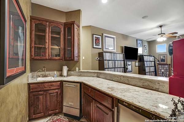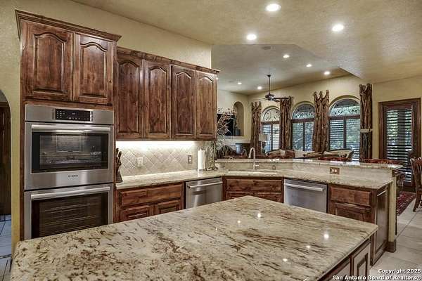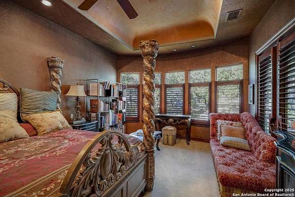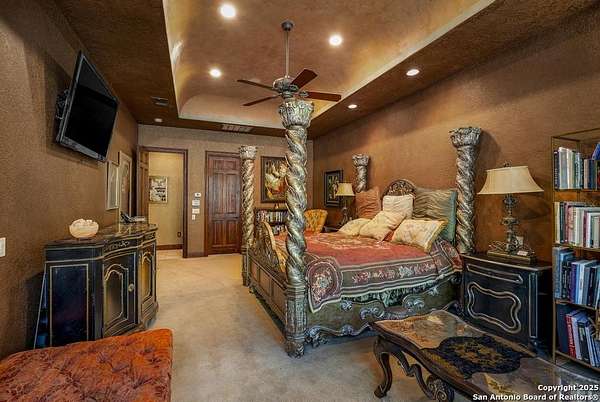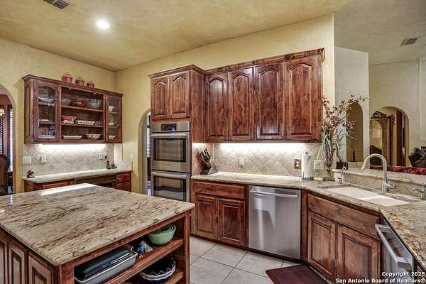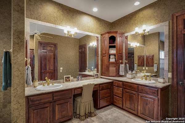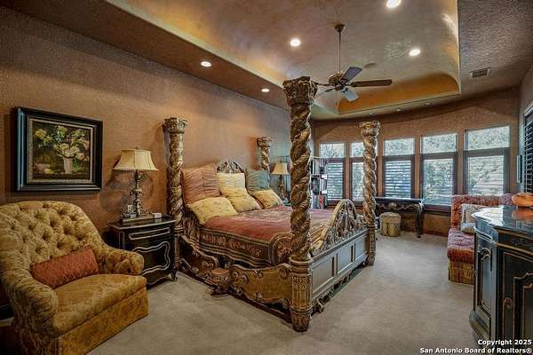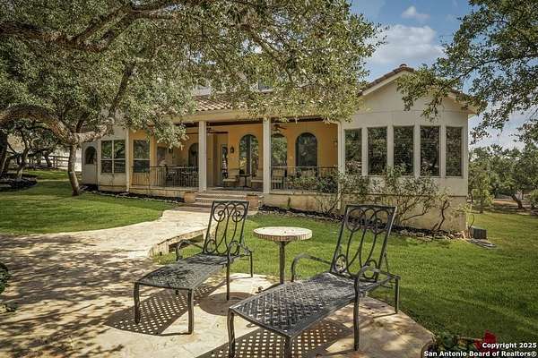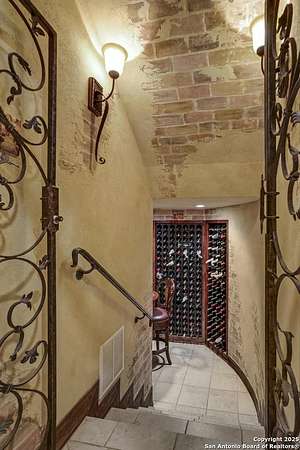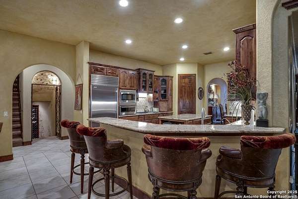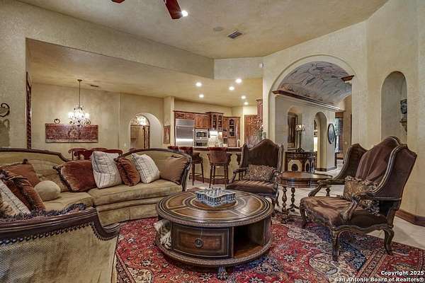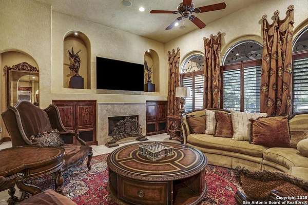 Offered furnished, this masterful blend of elegance and comfort, a custom-designed and thoughtfully crafted layout offers elevated finishes throughout. Arched openings, custom lighting, plantation shutters, and fresco-accented ceilings bring timeless character to every room. Dual primary suites on the main level, one with patio access create a versatile floor plan, while upstairs offers two additional bedrooms and baths, a media room, and a game room. The main primary suite is a serene retreat with a sitting area, private patio access, and a spa-inspired bath featuring dual vanities, a freestanding tub, a glass enclosed walk-in shower, and two custom closets. The chef's kitchen impresses with a five-burner gas cooktop, granite counters, double ovens, dual dishwashers, a warming drawer, and a walk-in pantry, complemented by a wine room with additional chiller. Additional features include a hidden room, built-in vacuum system, surround sound inside and out, and a fully gated property with three access points. Outdoors, the home transforms into a private resort with a pool, spa, waterfall bench, beach entry, outdoor kitchen, children's playscape, basketball court, and koi ponds connected by natural streams. The extended covered patio includes ceiling fans and a misting system for year-round comfort. An oversized three-car garage with built-in shelving adds ample storage. Set behind private gates in a small community near top-rated schools and major thoroughfares, this home delivers the perfect balance of sophistication, functionality, and resort-style living.
