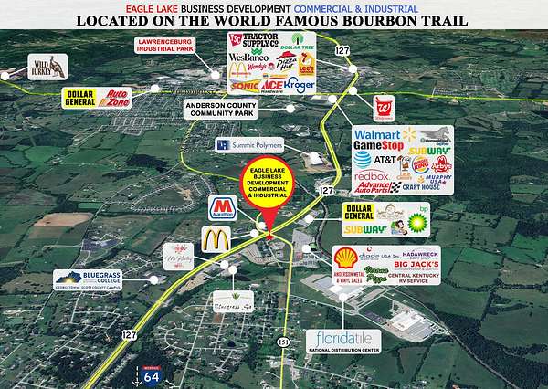 Welcome to this exceptional location in the Eagle Lake Business Development! A total of 8.41+- acres that are all contiguous have the possibility of rail access! Need ultimate exposure? The Eagle Lake Development is located at the JCT of HWY 127 & HWY 151 (which is a hard corner with traffic lights, turn lanes, etc.) Ideal for restaurant franchise, retail, financial institution, manufacturing, warehousing, shipping, or business of almost any type! Multiple commercial/industrial businesses on-site in this thriving development including; Subway, Don Pedro's, Verona Pizza & Pasta House, Big Jack's Cafe,H&R Block, Best Donuts, Diade Tile USA Manufacturing, Pool Solutions & Spa Center, Central KY RV, BP Fuel Station, Dollar General, Shell Fuel Station, & many more w/ McDonalds directly across from the development! Shovel ready & ready to build on. Fully developed; 8'' gravity flow sewer,6'' high pressure natural gas,12'' water,3-phase electric, high speed internet,& retention basin. Easy access for customers,& shipping companies.5 min from I-64, & approx 1 mile from Franklin County line. This 8.41+- acres being offered is located on the south side of Eagle Lake Drive (still very visible from HWY 127 and HWY 151) and is the large parcel that lays directly behind the Big Jack's Cafe building. Listing Broker relative to seller. This ad is for multiple lots within the Eagle Lake Development which in total equal 8.41+- of contiguous acreage and the 8.41+- acres are being offered as a whole. Public road may connect HWY 127/Eagle Lake Drive to create corner lots for lot #11 & #12 Call today to schedule your viewing!