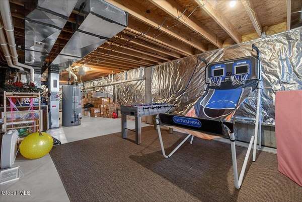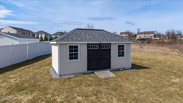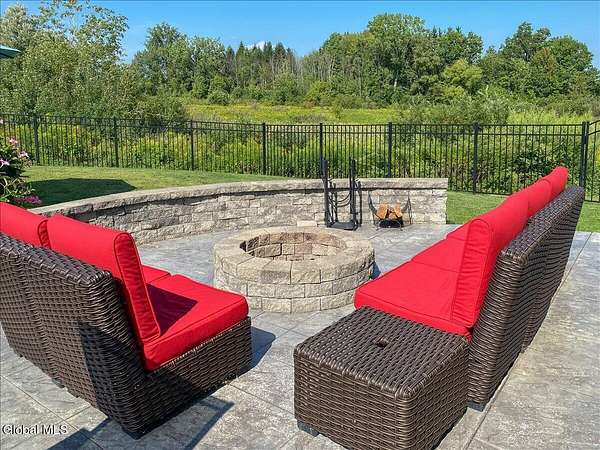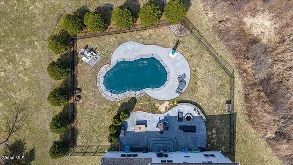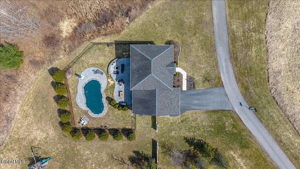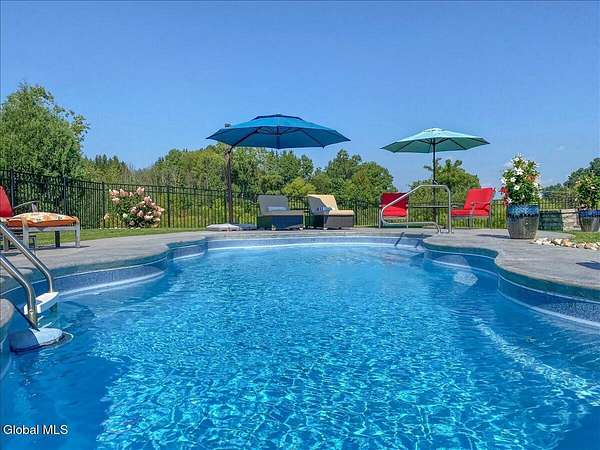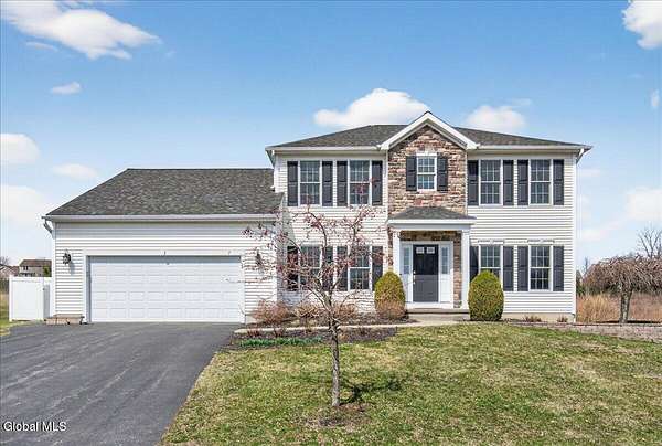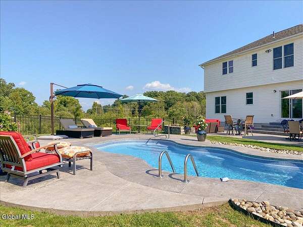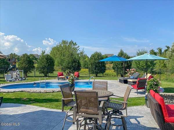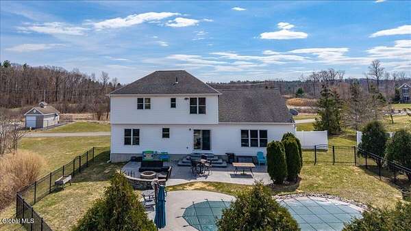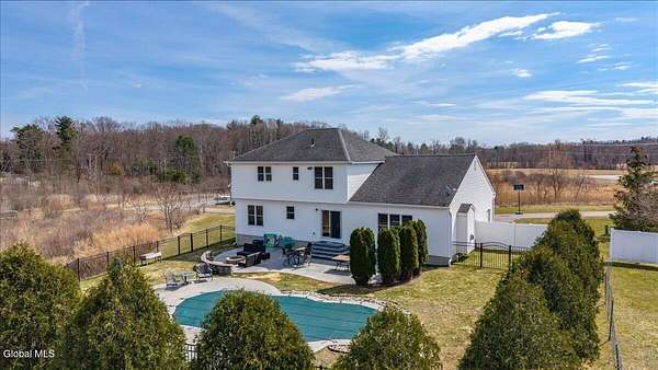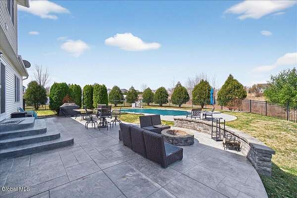 Set within one of Halfmoon's most desirable neighborhoods, this exceptional 2400 sq ft home offers the rare combination of privacy and neighborhood living on over twelve rolling acres. The outdoor setting is truly unmatched, featuring a heated fiberglass in-ground saltwater pool (new chlorinator 2022), stamped concrete surround, expansive paver patio, and a built-in outdoor fireplace overlooking the property's sweeping landscape. Inside, the two-story foyer welcomes you to thoughtfully designed living spaces with hardwood oak flooring on the first level and newer carpeting throughout. The kitchen features granite countertops, tile backsplash, updated appliances (2024), and a central island, opening to a family room with a gas fireplace. The formal dining room is highlighted by a tray ceiling and a shiplap wall. Upstairs, you will find the oversized primary suite offering a coffered ceiling and a spa-like bath with a soaking tub. Additional features include 9' ceilings on the first floor and in the partially finished basement, along with numerous updates throughout. White fence extension added in 2021. Dining room remodeled (2020), powder room remodeled (2023), new water softener (2024), and dryer vent cleaned and replaced (2025). Shed and swing set included. Seller requires a delayed closing or post-occupancy through August. This is a rare opportunity to own a private, resort-style setting within a neighborhood!