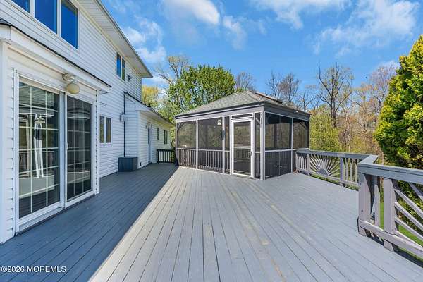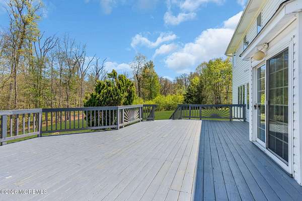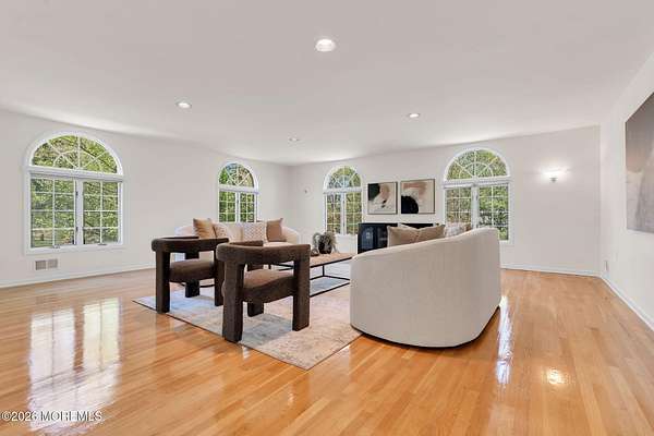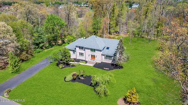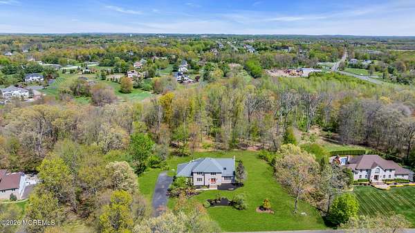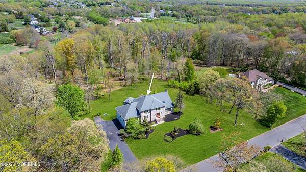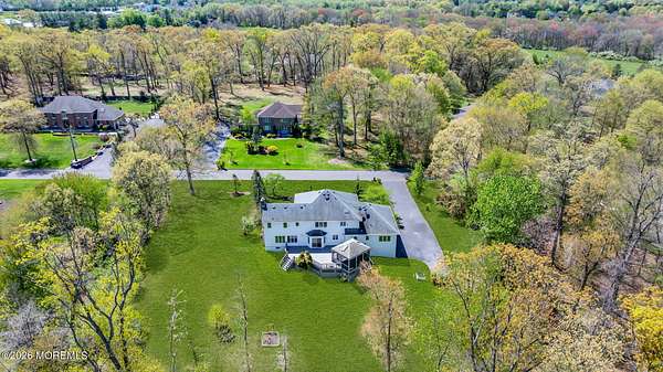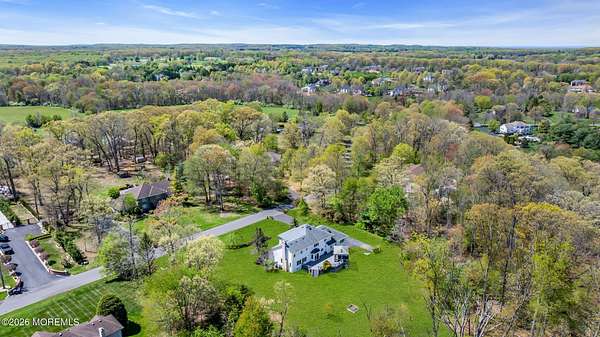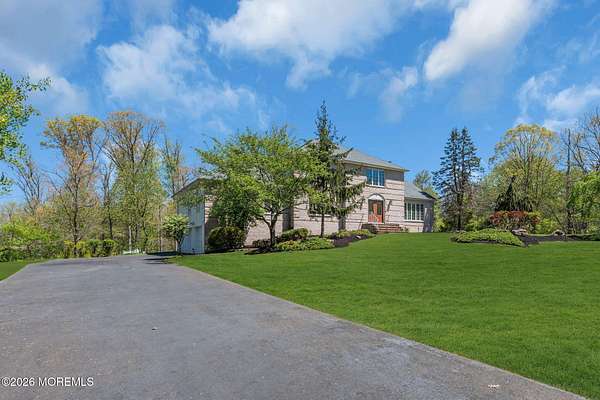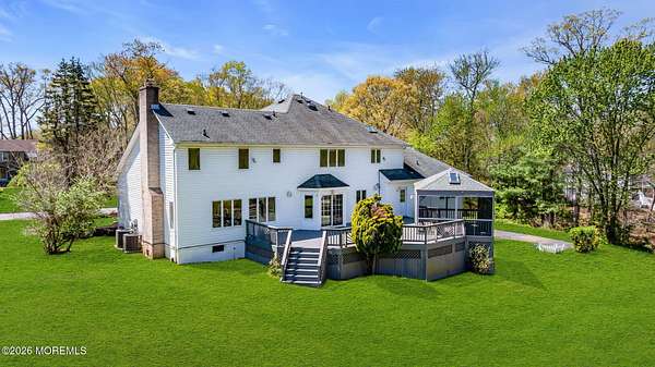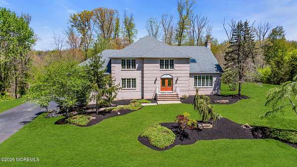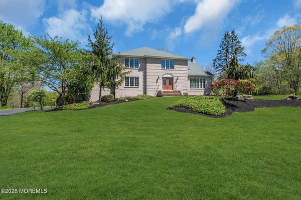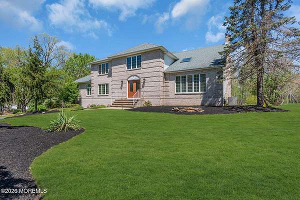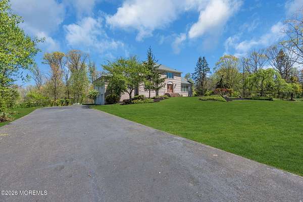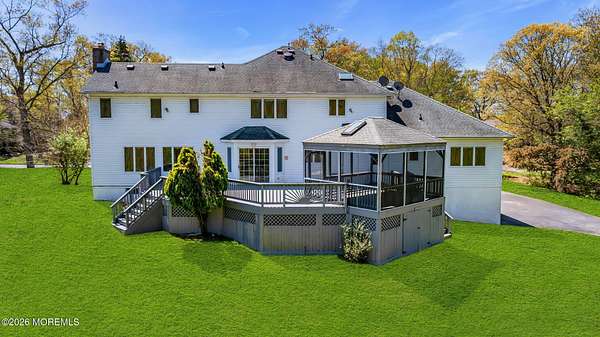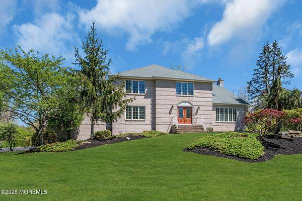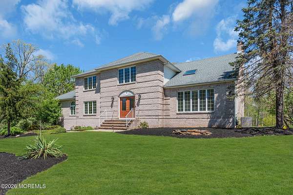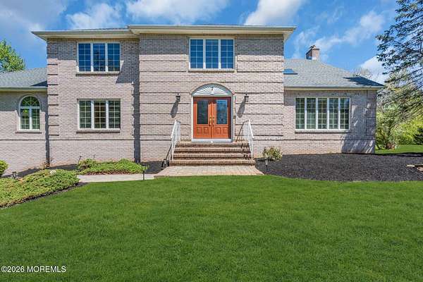 Welcome to this magnificent custom Colonial set on 1.88 private acres in Manalapan's prestigious Elton Pointe Estates. This stunning brick-front home offers 5 bedrooms, 3 full baths, and a 3-car attached garage, all set on beautifully professionally landscaped grounds with a serene, wooded backdrop. Step into the grand double-door foyer featuring dual closets, gleaming hardwood floors throughout the entire home, and a stunning bridal staircase that makes an immediate impression. The elegant living room showcases a dramatic two-story ceiling with skylights, filling the space with an abundance of natural light. The inviting family room features a gas fireplace and striking Palladian windows on two sides, bathing the space in natural light, and flows seamlessly into the gourmet eat-in kitchen. The kitchen is complete with custom cabinetry, stainless steel appliances, center island, pantry, and a beautiful tile backsplash. Sliding glass doors lead to a spacious deck featuring a screened-in gazebo a skylight perfect for entertaining or relaxing while enjoying the private, wooded setting. The formal dining room, accented with French doors, offers an ideal space for gatherings. The first floor also includes a generously sized bedroom, full bath, and a convenient laundry room with slop sink ideal for guests or multi-generational living. Upstairs, the bridal staircase overlooks the living room and leads to four spacious bedrooms, including a luxurious primary suite with a spa-like bath featuring a soaking tub, skylight, and dual vanities, along with his-and-hers walk-in closets. A full hall bath with double sinks completes the second level. Additional highlights include a full basement with access to the 3-car garage, underground sprinkler system, central vacuum, and dual-zone gas heat and central air for optimal comfort and efficiency. The beautifully landscaped grounds provide exceptional privacy and tranquility. This exceptional home offers space, elegance, and privacy truly a must-see!