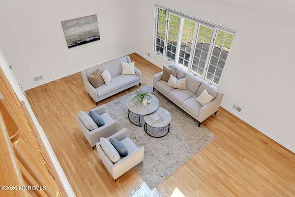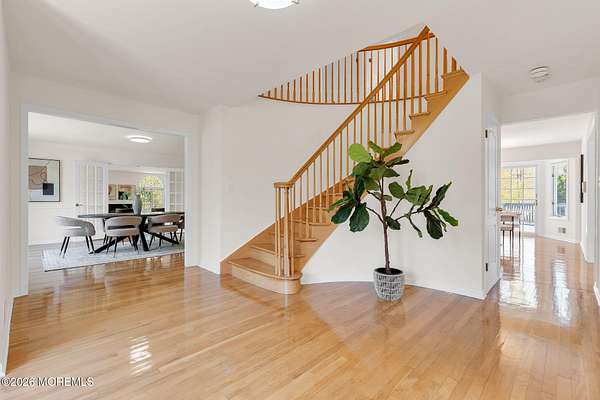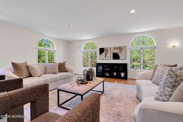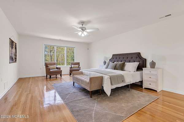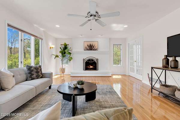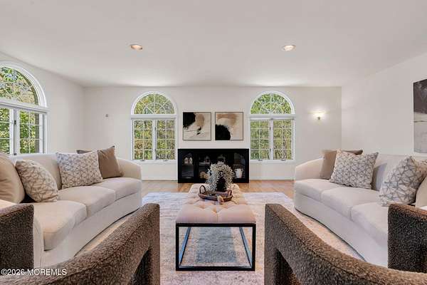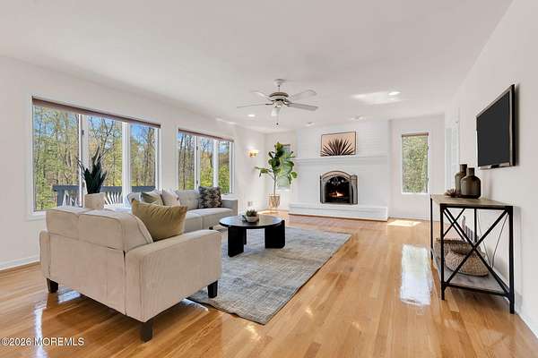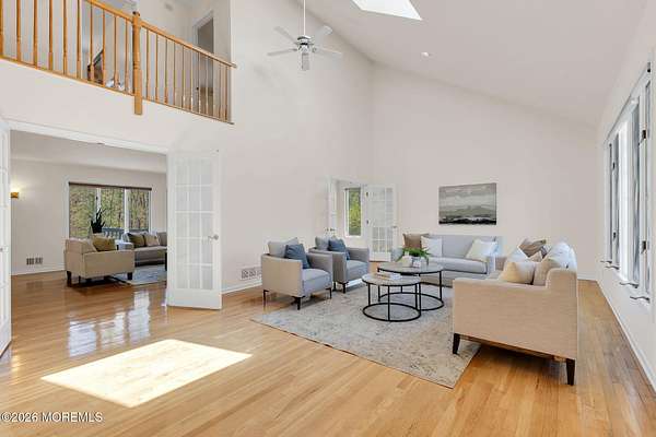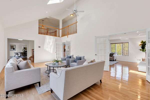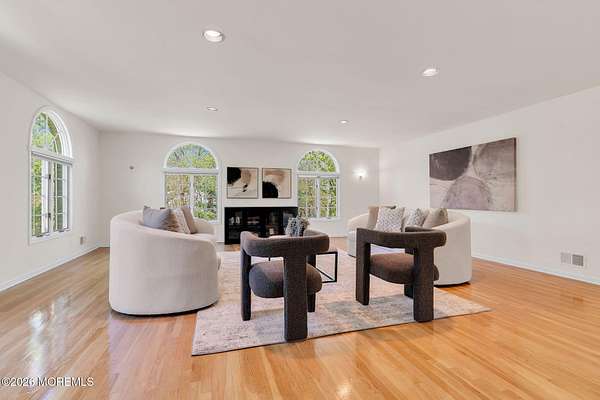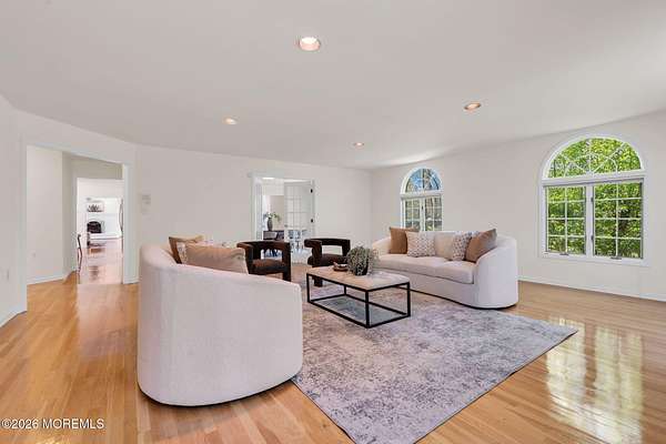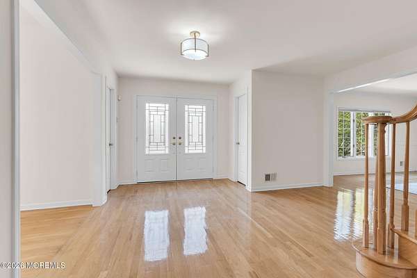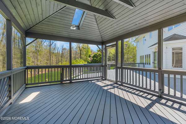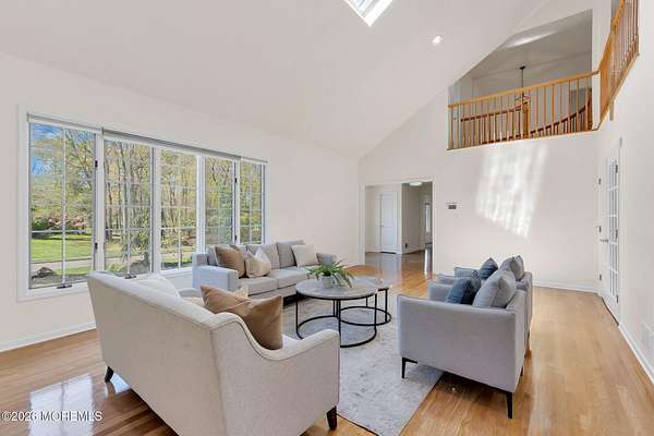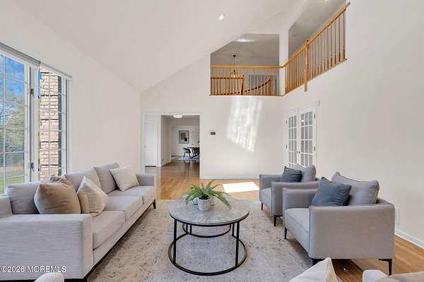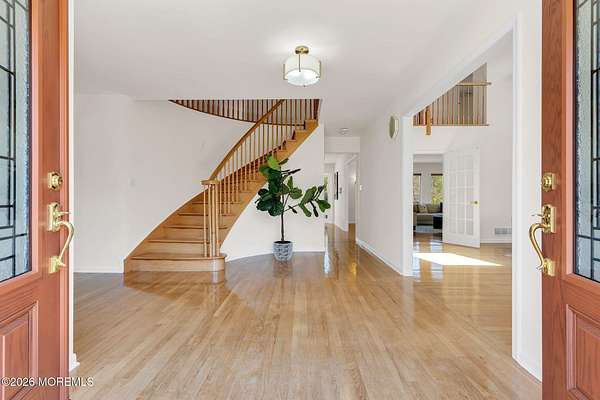 Welcome to this magnificent custom Colonial set on 1.88 private acres in Manalapan's prestigious Elton Pointe Estates. This stunning brick-front home offers 5 bedrooms, 3 full baths, and a 3-car attached garage, all set on beautifully professionally landscaped grounds with a serene, wooded backdrop. Step into the grand double-door foyer featuring dual closets, gleaming hardwood floors throughout the entire home, and a stunning bridal staircase that makes an immediate impression. The elegant living room showcases a dramatic two-story ceiling with skylights, filling the space with an abundance of natural light. The inviting family room features a gas fireplace and striking Palladian windows on two sides, bathing the space in natural light, and flows seamlessly into the gourmet eat-in kitchen. The kitchen is complete with custom cabinetry, stainless steel appliances, center island, pantry, and a beautiful tile backsplash. Sliding glass doors lead to a spacious deck featuring a screened-in gazebo a skylight perfect for entertaining or relaxing while enjoying the private, wooded setting. The formal dining room, accented with French doors, offers an ideal space for gatherings. The first floor also includes a generously sized bedroom, full bath, and a convenient laundry room with slop sink ideal for guests or multi-generational living. Upstairs, the bridal staircase overlooks the living room and leads to four spacious bedrooms, including a luxurious primary suite with a spa-like bath featuring a soaking tub, skylight, and dual vanities, along with his-and-hers walk-in closets. A full hall bath with double sinks completes the second level. Additional highlights include a full basement with access to the 3-car garage, underground sprinkler system, central vacuum, and dual-zone gas heat and central air for optimal comfort and efficiency. The beautifully landscaped grounds provide exceptional privacy and tranquility. This exceptional home offers space, elegance, and privacy truly a must-see!