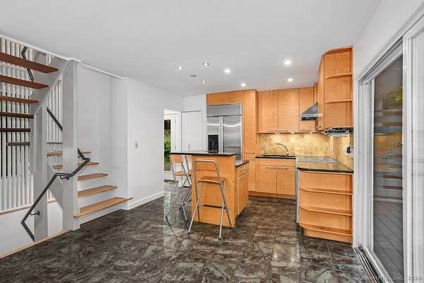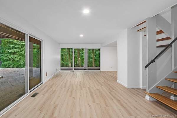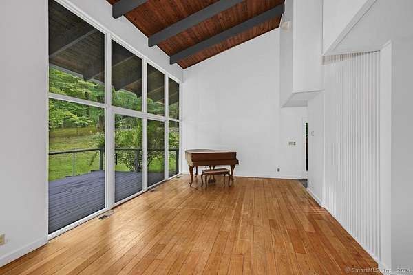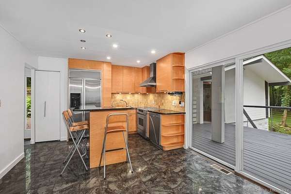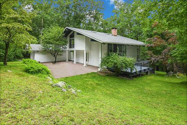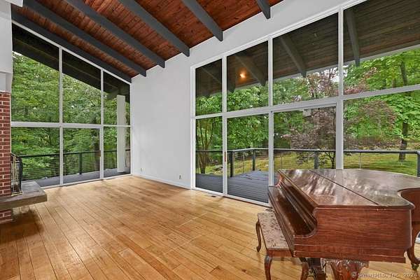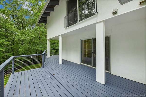 Beautiful mid century home with walls of glass, elevated ceilings, wrap around deck, and patio. If you love feeling as if the outside is part of your interior world this may be your perfect rental home. Beautiful open floor plan with a fireplace in the living room and dining room, updated granite high end kitchen all open to the wrap around deck. Primary bedroom with en-suite and three additional bedrooms make up the second floor. Lower level walk out with potential in-law, family room, fireplace, and office space. The interior and deck have recently been painted. Just over 2 miles to Weston Center - it doesn't get better than this!
