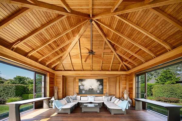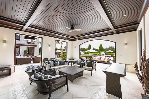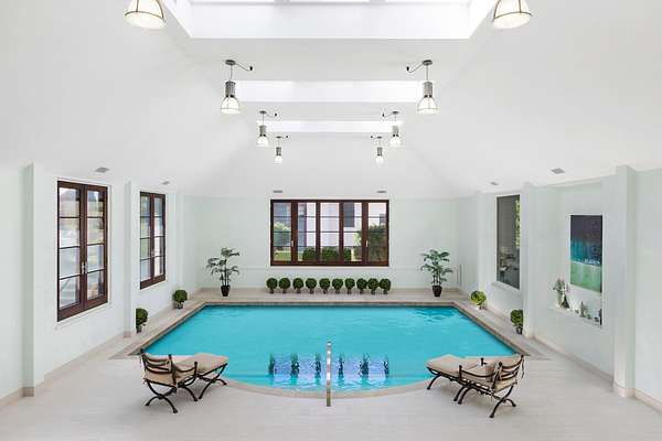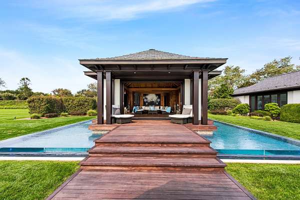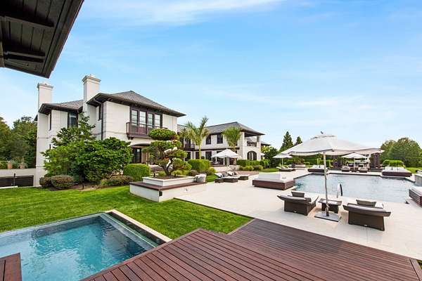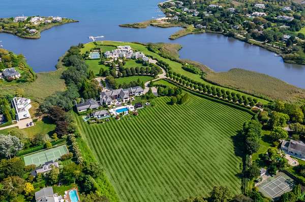 Set on a private peninsula on Mecox Bay, this stunning 12.2 +/- acre estate is now available for purchase. With 28,000 +/- square feet of living space across three levels, the magnificent residence boasts 11 bedrooms, 14 full bathrooms, and 5 powder rooms. Upon entry, a grand foyer with dual staircases introduces the main level and showcases a flood of natural light through floor to ceiling windows. The well equipped eat-in kitchen highlights stainless steel appliances and marble countertops with a generous stew pantry, and is accompanied by a formal dining room with seating for ten. Outfitted for all season dining, the exterior family room affords additional seating. The formal living area is joined by a private study and a separate den with a fireplace and wet bar. Access to the attached 3-car garage, staff bedroom, and three powder rooms complete this floor. The secondary level offers a spacious primary suite along with six guest bedrooms, four of which are ensuite. The guest wing is joined by two seating areas, an office, and an upstairs laundry room, while multiple terraces present sweeping views across the expansive estate and towards Mecox Bay. Fit for entertaining, the lower level presents an abundance of amenities including a 14-seat movie theatre, 2-lane bowling alley with a viewing area for 12 people, half court basketball, professional gym, 350 bottle wine cellar, and a game room with billiards, 750 gallon shark tank, wet bar, arcade, and ping pong table. The downstairs also provides three bedrooms, two bathrooms and a staff area with kitchenette, living room, and dining room. Accommodating all aspects of relaxation, the residence is equipped with a massage room, spa with sauna and steam room and an indoor swimming pool. With no detail or amenity spared, the exterior hosts numerous entertainment elements including a courtyard with a fire pit and concealed outdoor television, multiple lounging areas, heated pool with a spa and waterfall, half basketball court, and an outdoor dining area with large grill and pizza oven. Surrounded by a moat, the pergola and separate pool house affords a kitchenette and full bathroom. With a picturesque setting and a backdrop of bay views, this resort-like estate is truly a unique south of the highway opportunity.