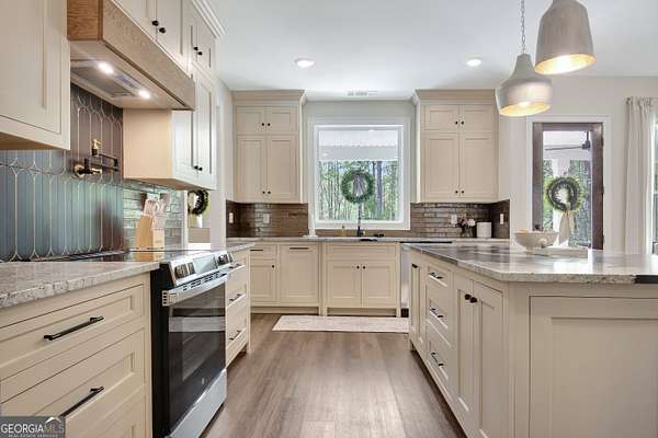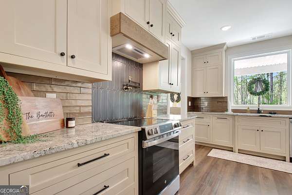 This is the one you've been waiting for-and you will want to see it in person ASAP. Situated on 3 beautiful acres with a peaceful creek in the sought-after Centralhatchee School District, this 4 bedroom, 2 full bath, 1 half bath home blends custom design, thoughtful function, and unforgettable style. From the moment you step inside, the custom lighting throughout sets the tone-warm, elevated, and designed to impress. The LVP flooring throughout offers both durability and seamless flow, while the iron ore black fireplace with an oversized mantle creates a bold and inviting focal point in the living space. The kitchen is truly the heart of this home-and it delivers a wow factor. Featuring: A large statement island perfect for gathering Leathered granite countertops throughout Rich chocolate beveled subway tile paired with a striking black & gold backsplash Custom soft-close cabinetry with abundant drawers Pot filler and built-in cup/glass rinser for added convenience This space was designed for both everyday living and entertaining with ease. The thoughtful layout continues with a spacious pantry, a functional mud room off the back entry, and a well-appointed laundry room complete with sink, cabinetry, storage, and built-in organization. Even better-the laundry connects directly to the primary closet and bathroom, creating a seamless daily routine. The split bedroom plan offers privacy, while each bathroom showcases unique, one-of-a-kind fixtures that elevate the home's custom feel. Step outside and you'll find even more to love. The covered back patio, connected to the 2-car carport, creates the perfect setting for hosting and relaxing. The detached garage with side porch offers incredible flexibility-ideal for extra vehicles, a workshop, or hobbies. The backyard has been thoughtfully cleared to provide open space for entertaining, gardening, or simply enjoying your land, all while taking in the natural beauty of your own creek. Homes with this level of detail, space, and setting don't come along often. Come experience it for yourself-and come home.