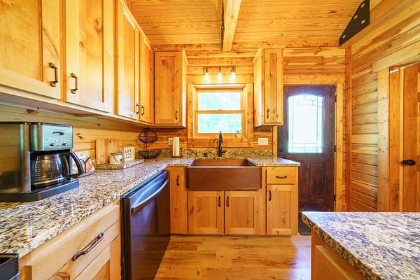 Granite countertops, copper farm sink, and black stainless appliances