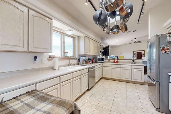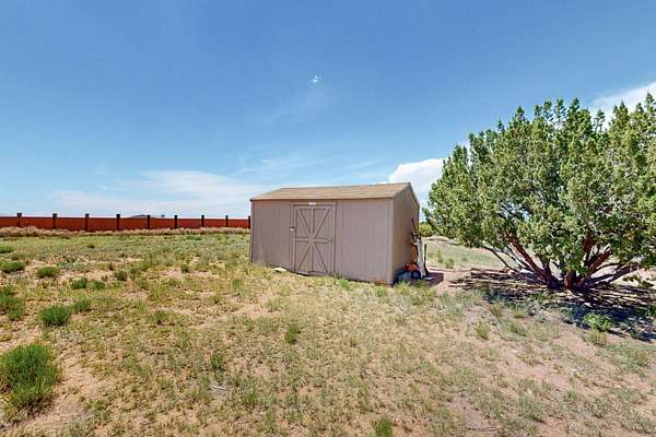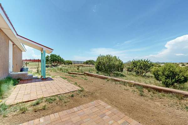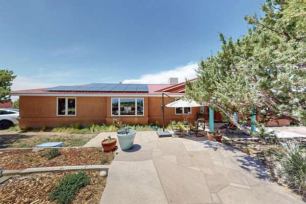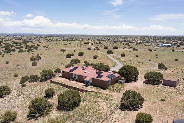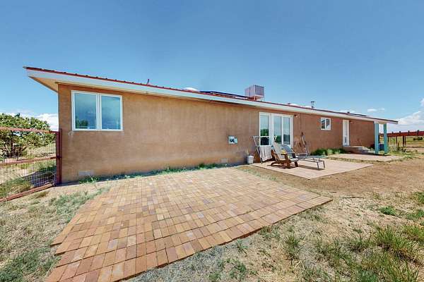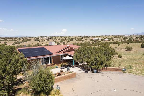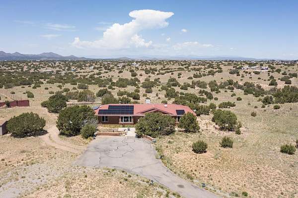 Pre-inspected and in excellent condition! Enjoy sunrises and sunsets on both patios at the Bluebird Ranch! This 2,270 sqft. home has 3 bedrooms, 2 bathrooms and 2 living areas. Larger windows, many skylights and tall ceilings that make it very bright and airy. The property is situated on 12.3 fully fenced acres on a paved road with unobstructed 360 views, fenced for dogs and/or horses or? Spacious and luxurious main BR with ensuite bathroom and huge walk in closet, completely energy efficient; newer, owned solar; NM Surf terrestrial internet service. Private, sweet water well that produces 18 gpm; metal hay barn with attached 7ft. hay corral; storage shed plus wide and tall RV storage barn; close to Bonanza horse Hospital. Many Junipers and no cactus. Make this rural ranch style electric gated property yours! 4 goats resident on the property that maintain the landscaping!!