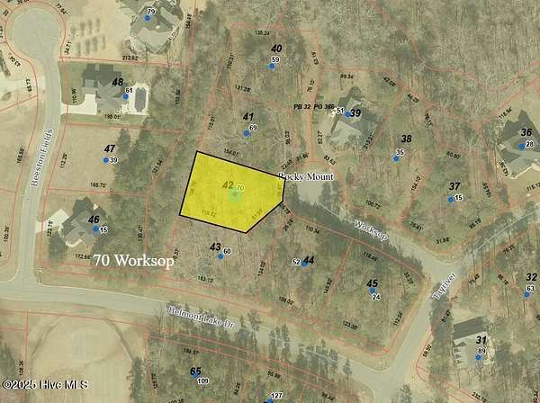 From 64E take Exit 466 for Winstead Ave. Left on Winstead Ave, go @ 5.1 miles on Tom Betz Parkway. Left on Bishop Road (you'll pass Wesleyan College campus on left). Left onto Belmont Farms Pkwy (you will see the Belmont Lake Preserve sign entrance). Left on Belmont Lake Drive. Pass Aberdeen, next right on Tayriver. First left on Worksop. Wooded lot on left in cul de sac.