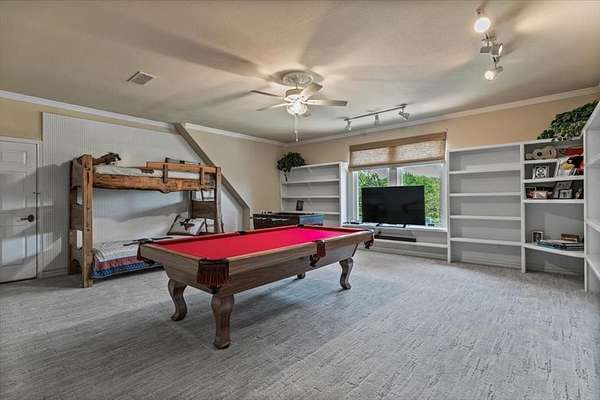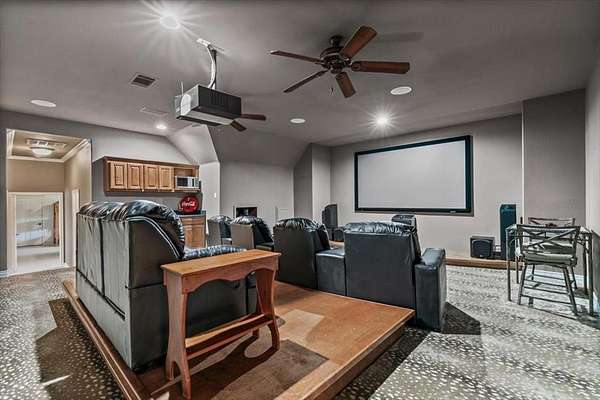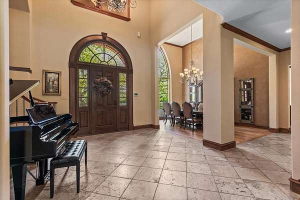 Entertain effortlessly in the expansive game room, media room, or outdoors in the oversized fenced pool area complete with a fully-equipped outdoor kitchen. A picturesque pond with a covered concrete sitting area and a treed backyard provide peaceful natural views, all centered around a stunning pool that seamlessly connects the main residence to the guest house.