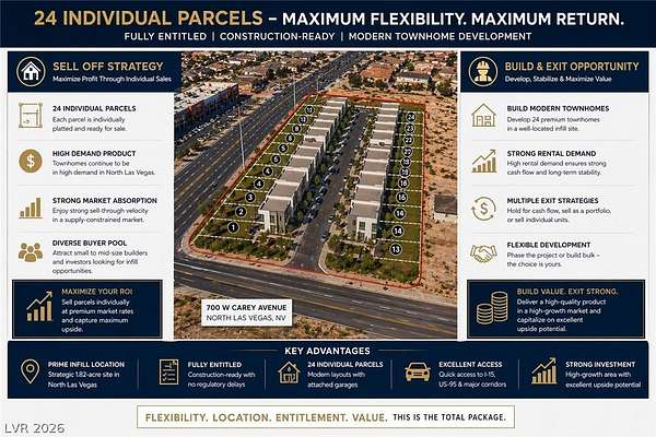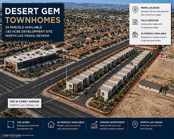Opportunity to acquire a fully entitled, construction-ready development site in one of the fast growing corridors of the N. Las Vegas metro. This 1.82-acre parcel comes subdivided into 24 lots with water rights already in place- eliminating the time, cost, and risk of the entitlement process. Bring your designs and build! Strategically positioned on the corner of W. Carey Avenue & Revere. Actual Strip views when standing on the land itself. With excellent visibility, access and frontage, this site sits within an established residential neighborhood experiencing strong demand for new housing. Across the street a new strip mall with 4 eateries. Surrounded by newer homes & 2 churches. A high end, newer single family community sits across Carey. Property also sits just inside of the North Las Vegas "Opportunity Zone." Visit the IRS.gov website or HUD.gov to learn how you can save on capital gains & increase your returm on this investment.