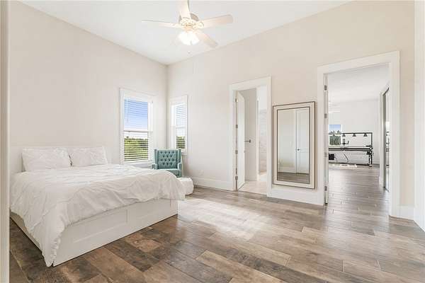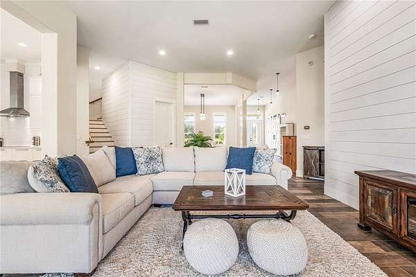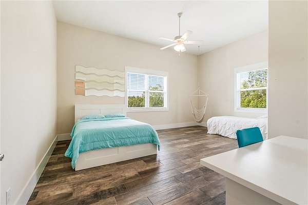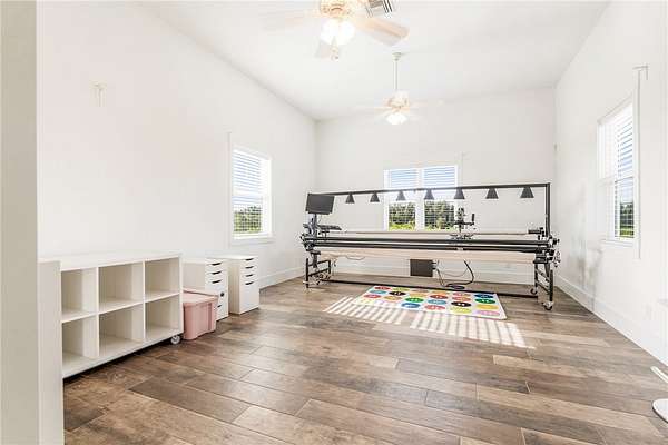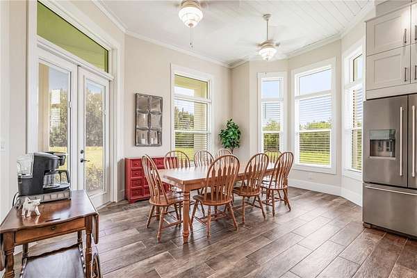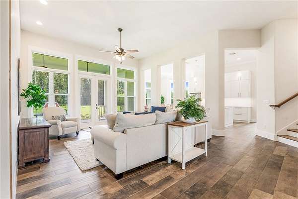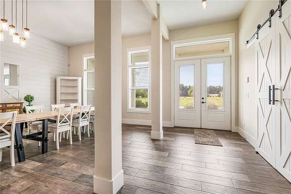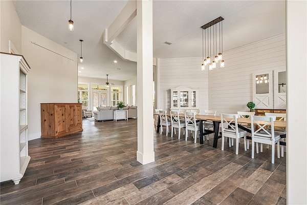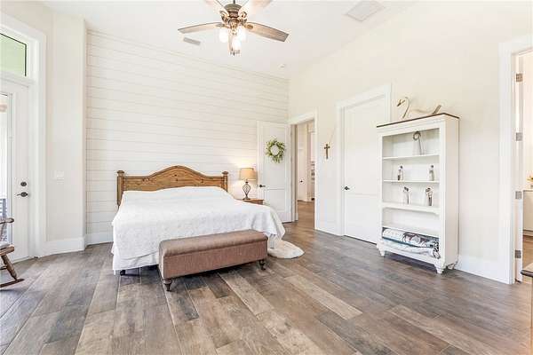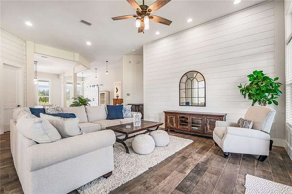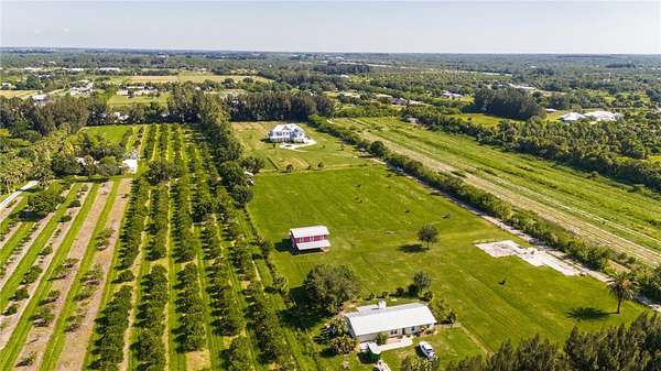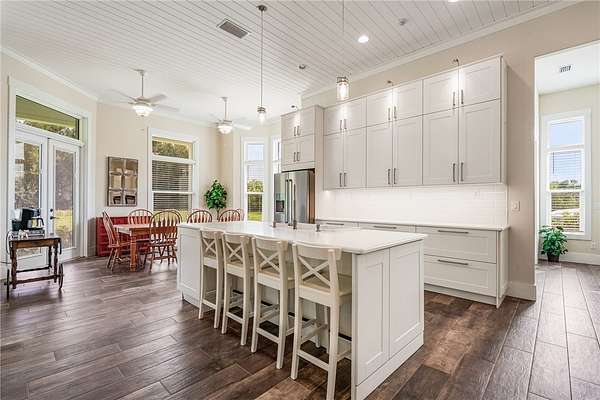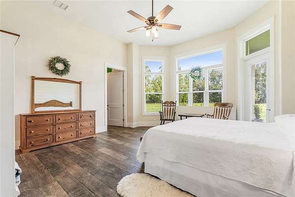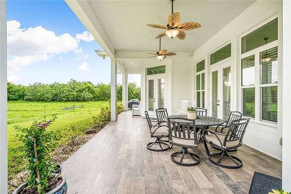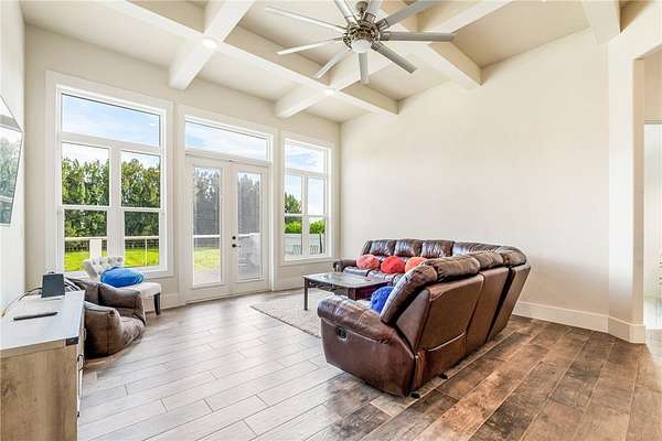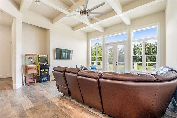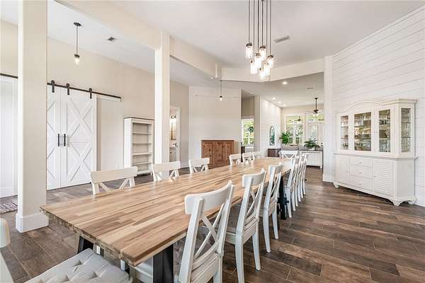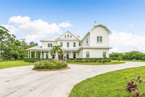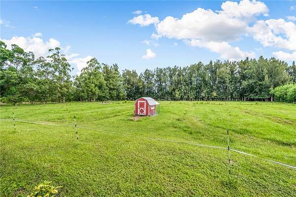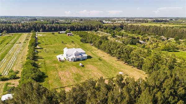 This quintessential agricultural estate is set on nearly 9 private, fully fenced and gated acres, featuring a stately 6,588 sq ft custom home built in 2019 offering wrap-around porches, 12' ceilings, and light-filled living spaces. Features include 5 ensuite bedrooms with custom closets, multiple family rooms, offices, gym, gourmet island kitchen, and walk-in pantry. A barn with capacity for 5 stalls and a tack room adds equestrian potential. Built with impact windows, metal roof, and spray foam insulation, this estate is as solid as it is stylish, with mature pines ensuring privacy.