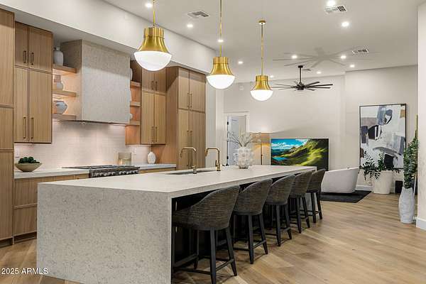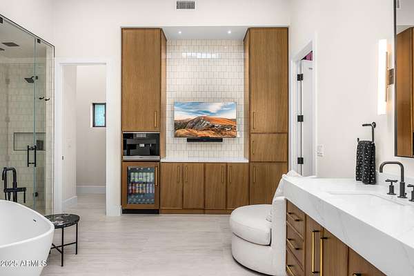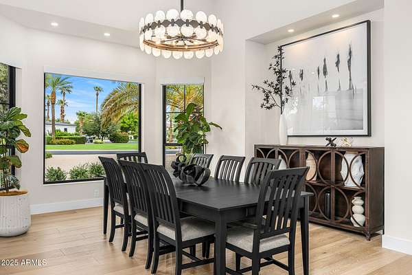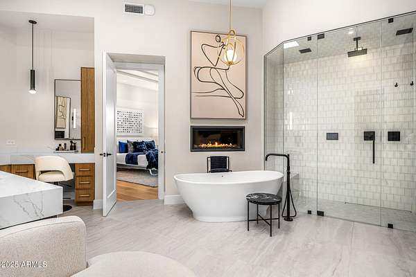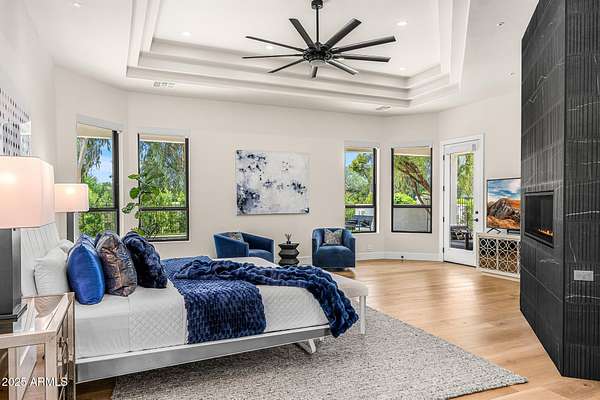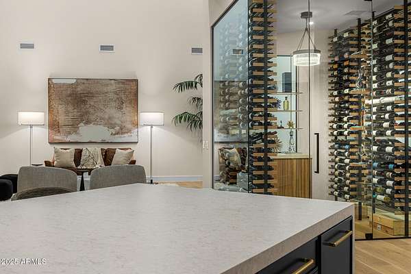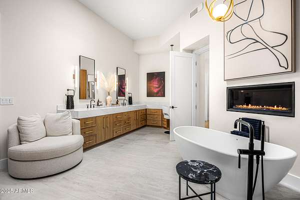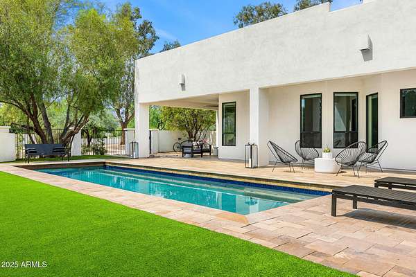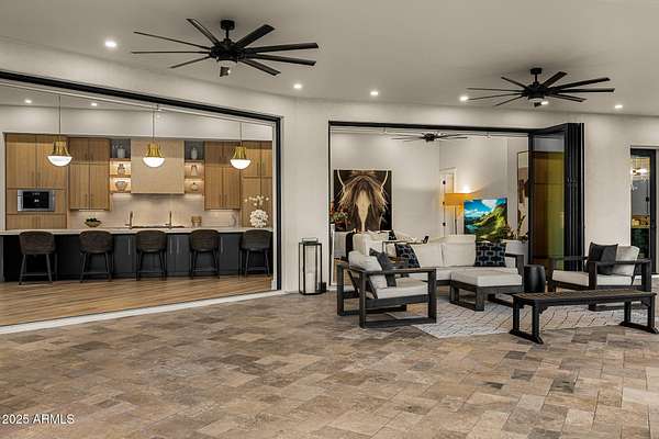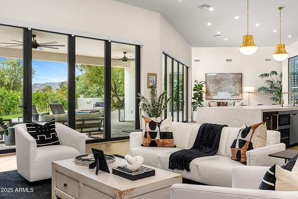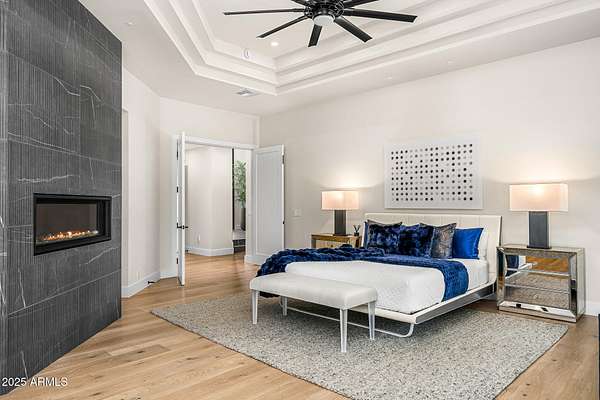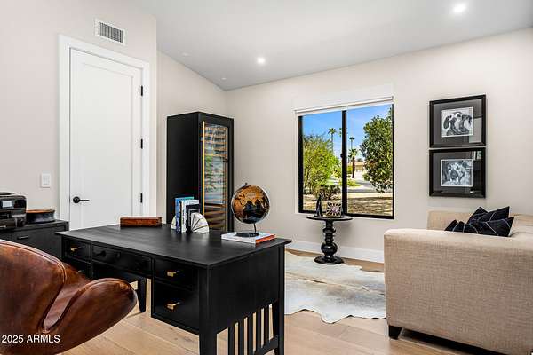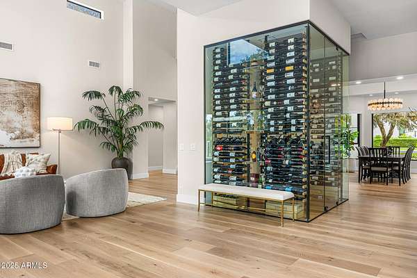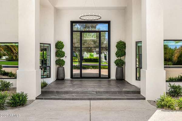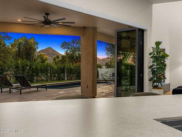 Straight out of the pages of a design magazine, this Paradise Valley showpiece defines modern luxury. Every element has been thoughtfully curated-from the impeccable designer finishes to the vast open floor plan framed by breathtaking views of Camelback and Mummy Mountain, alongside the lush fairways of the neighboring golf course. This 4 bedroom, 4.5 bathroom estate with an 8-car garage(stacked) marries organic modern beauty with timeless elegance. The dramatic foyer welcomes you with soaring ceilings, a striking fireplace, & seamless sightlines to the outdoors. Accordion glass doors blur the boundaries between inside and out, creating the ultimate indoor-outdoor living experience. The chef's kitchen is both a statement and a sanctuary, featuring an oversized quartz waterfall island wit matching custom range hood, bespoke cabinetry, and top-of-the-line appliances including a Miele coffee system, Sub-Zero refrigerator and freezer, Wolf range, and a separate beverage fridge. A temperature-controlled wine and tasting room completes the entertainer's dream. The primary suite is a retreat unto itselfboasting a spa-inspired bath with a steam and aromatherapy shower, soaking tub, dual vanities with dedicated makeup station, beverage center, and a boutique-style walk-in closet with private laundry. Outdoors, newly planted ficus trees ensure privacy, while the expansive side yard offers endless potential for a sport court, guest casita, or custom amenities. Every space of this home has been designed to deliver both elevated living and everyday comfort in one of Paradise Valley's most coveted settings.