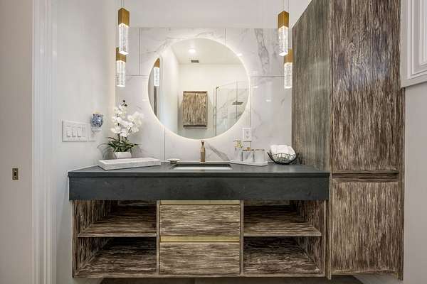 The guest home provides two separate living areas, ideal for family, guests, or rental income. Each unit includes a full kitchen, bathroom, bedroom, living room, and office space, along with a shared laundry area for added convenience.