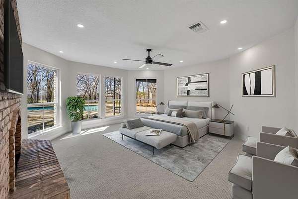 The downstairs primary features a cozy brick fireplace for cool evenings.